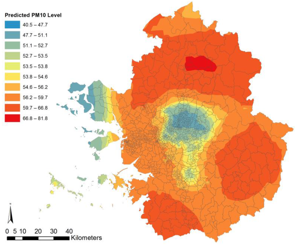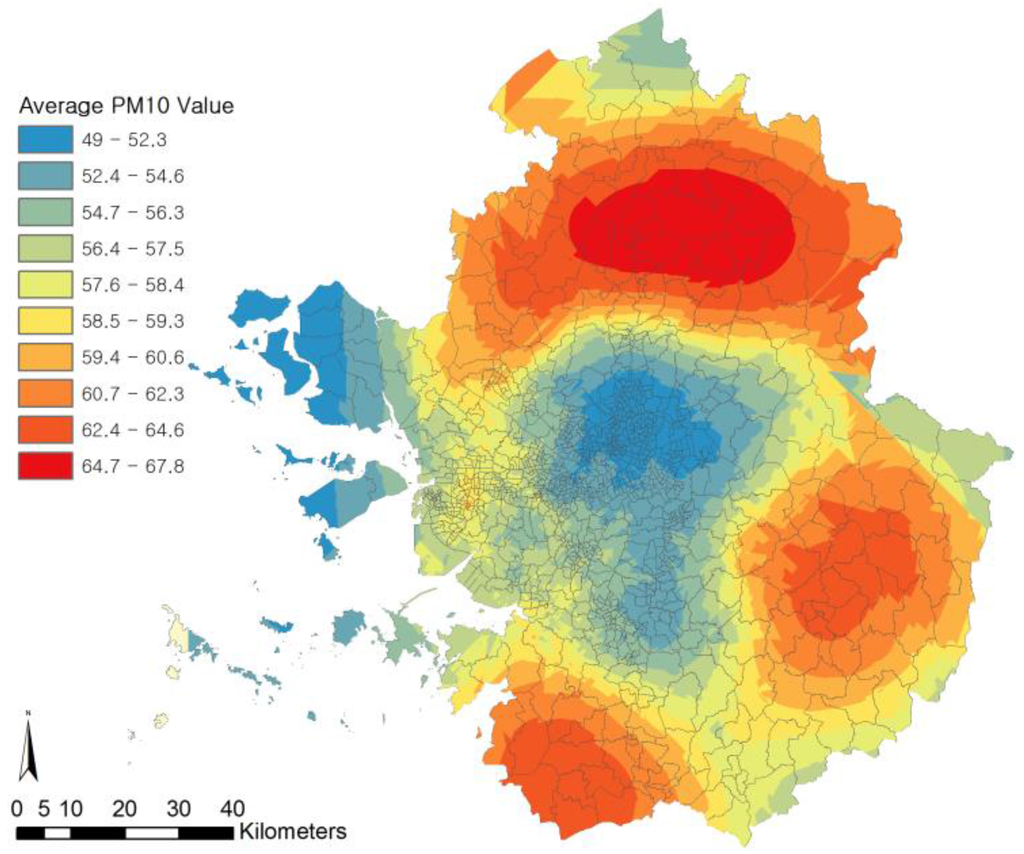 Because PM10 levels were measured at only 128 monitoring stations, no PM10 data was available for many administrative areas. We estimated PM10 concentration levels at unobserved locations utilizing the Kriging method (Figure 2). The Kriging method of interpolation weights observed surrounding data points according to spatial covariance values, thus predicting values for unmeasured locations. Hence, the PM10 concentration levels for the whole capital region were estimated from the data observed at the monitoring stations. Because the administrative district served as the unit of analysis, we calculated the average PM10 value for each district (Figure 3). As seen in Table 1, the average PM10 concentration level in 2010 in the capital region was 55.5 μg/m3, which is much higher than the World Health Organization’s guideline (20 μg/m3). This value shows how serious the PM10 problem is in the region.
