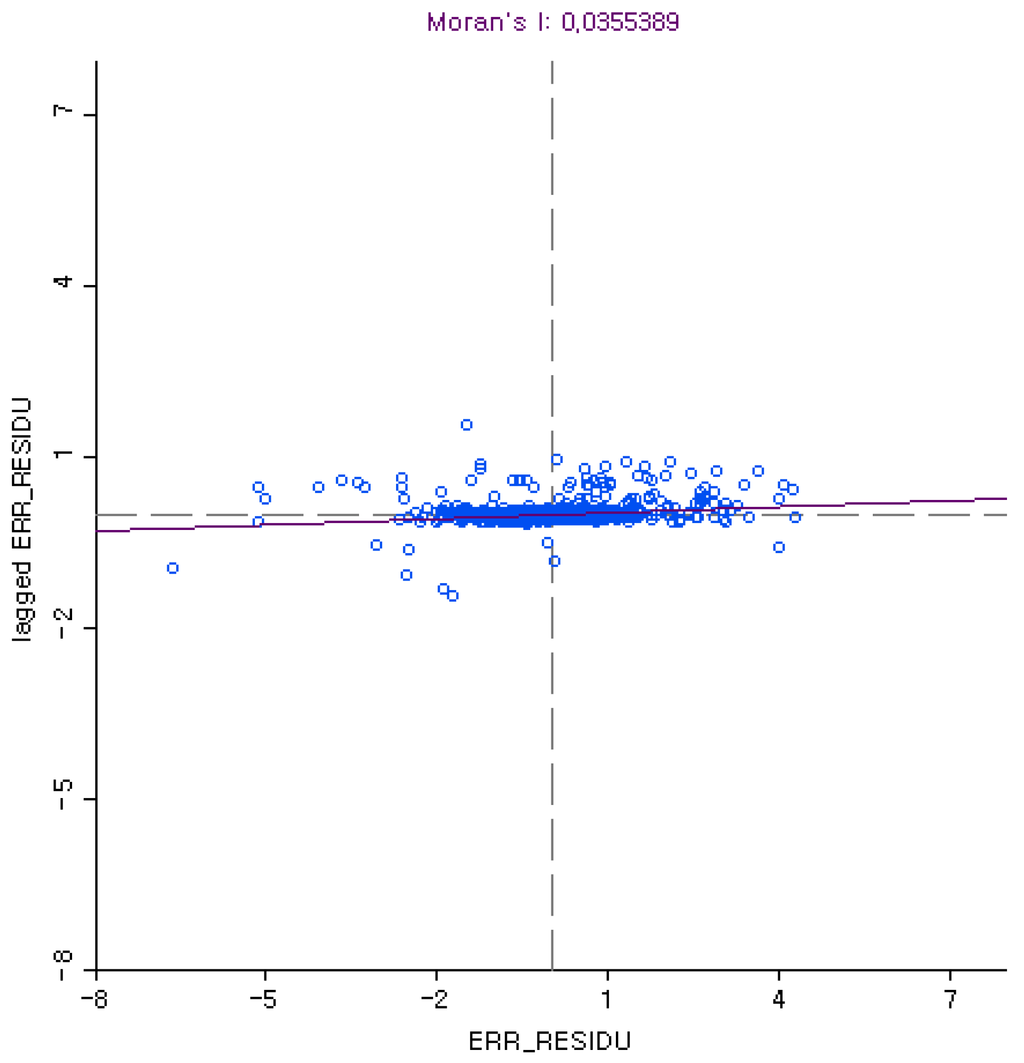 Having identified spatial autocorrelation, SEM and the spatial lag model (SLM) can control for spatial autocorrelation using a spatial weight matrix, overcoming the limits of OLS [47]. SLM assumes that spatial autocorrelation occurs in the observed values of individual dependence variables and thus controls for spatial autocorrelation by applying the spatial weight matrix (ρWy) to observed close values that affect each observed value [48].