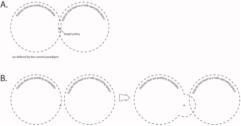 This process makes reference to the “two circle” model of paradigm change [10] as presented in case B of Figure 3 below, where useful paradigm changing outcomes from early sequenced policies lay the foundations for previously “out-of-paradigm” policies to be implemented in subsequent steps. This is in contrast with the less problematic case, A, where there is already at least one publicly acceptable “target policy” which overlaps with a safe operating space (and the paradigm context provides the foundations for policy makers with the opportunity to create a sustainable path for resource use). This is not true for case B where the target policies as created by policy analysis do not overlap with a safe operating space. Here the key is to design a policy pathway which, whilst challenging, is publicly acceptable to present citizens but that moves the paradigm towards one compatible with a safe operating space in the longer-term, through a series of “stepping-stone” sequencing policies which might appear to not be achieving the policy goal in the most efficient way.