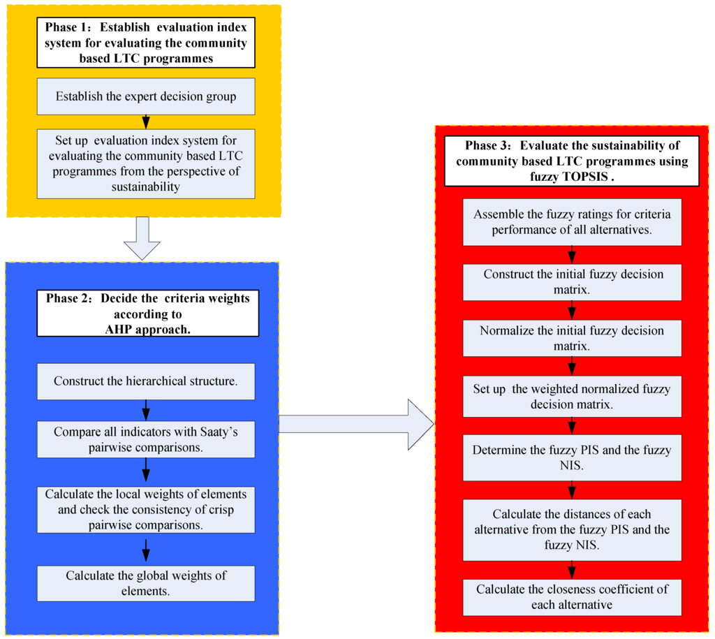 - A hybrid MCDM method based on FDM-AHP-Fuzzy TOPSIS has been pilot conducted in this study. This is a novel research method for evaluating community-based LTC programmes. This research method overcomes the defects of previous studies that lack a weighting strategy within indicators, and it could be applied to measure the degree of sustainability and make effective scoring and rating among different programmes.