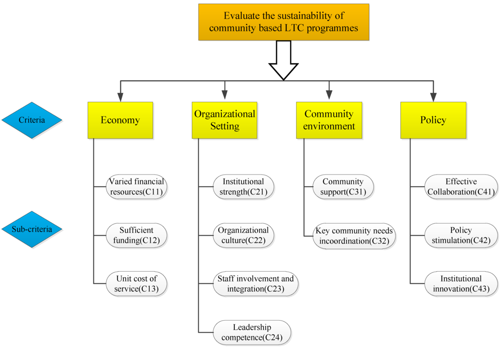 - After 12 evaluation criteria with four perspectives are selected through FDM, the multi-layer structure of the sustainability of LTC programmes is constructed. The hierarchy contains three levels, as shown in Figure 2.
