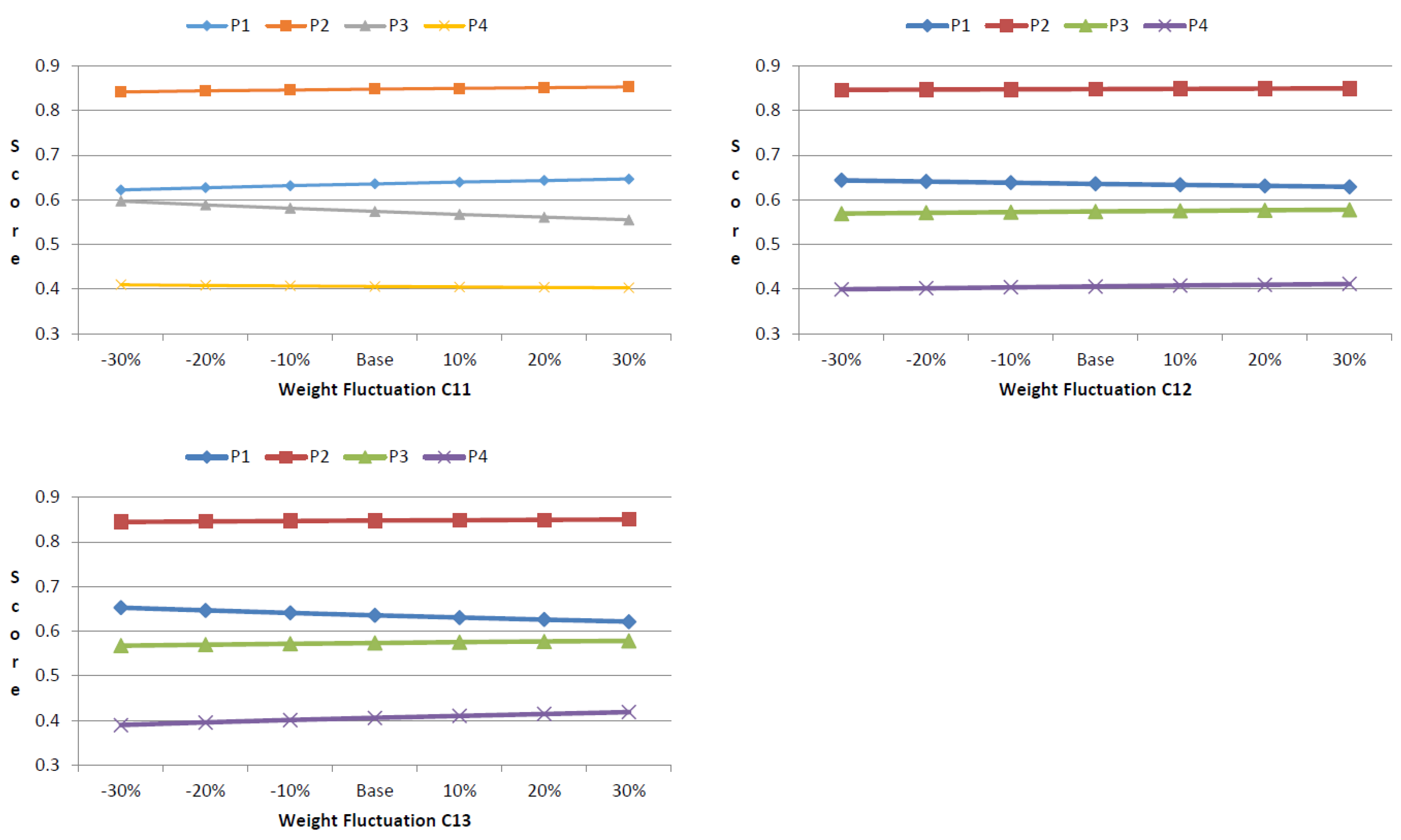 As illustrated in Figure 4, the final outcomes of P1 and P2 increase when sub-criterion C11 gets more weights, while P3 declines if the weight of C11 becomes less important. P4 reflects a steady change with the fluctuation of C11. When C12 has been given more weights, only P1 indicates a small downward trend, while the outcomes of others keep stable. In the case of C13, P1 and P3 indicate a relative opposite tendency with the weight fluctuation of C13, while P2 remains stable and P4 shows a steady increase with the increased weight of C13. Apparently, C11 and C13 are sensible sub-criteria that significantly influence the sustainability of the community-based LTC programme. However, P2 is always the best programme among all regardless of the weights change from economy perspective.