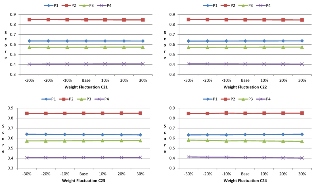 Sensitivity analysis in the organizational setting group (Figure 5) indicates the results of all community-based LTC programmes illustrate tiny fluctuation, however the change of the sub-criteria from C21 to C23. Furthermore, the scores of P1 and P3 upon the fluctuation of C23 and C24 remain an opposite variation trend. Therefore, regardless of the sub-criteria weights in the organizational setting group change, P2 and P4 are the best and worst sustaining LTC programmes, respectively.