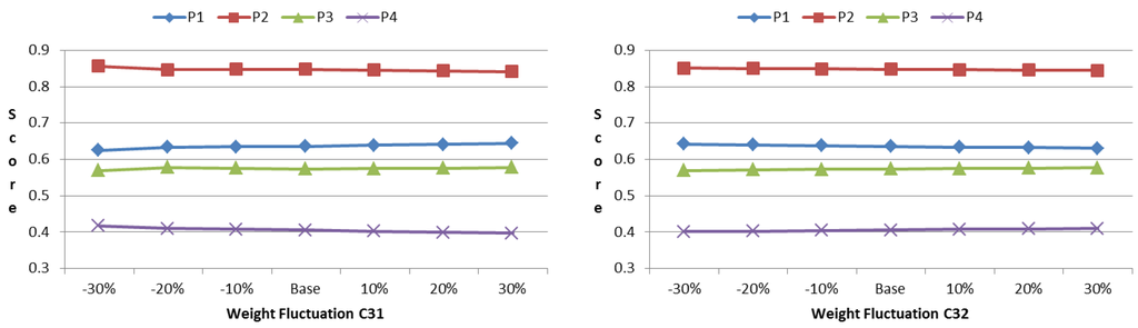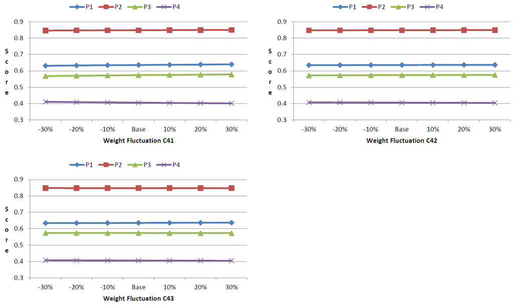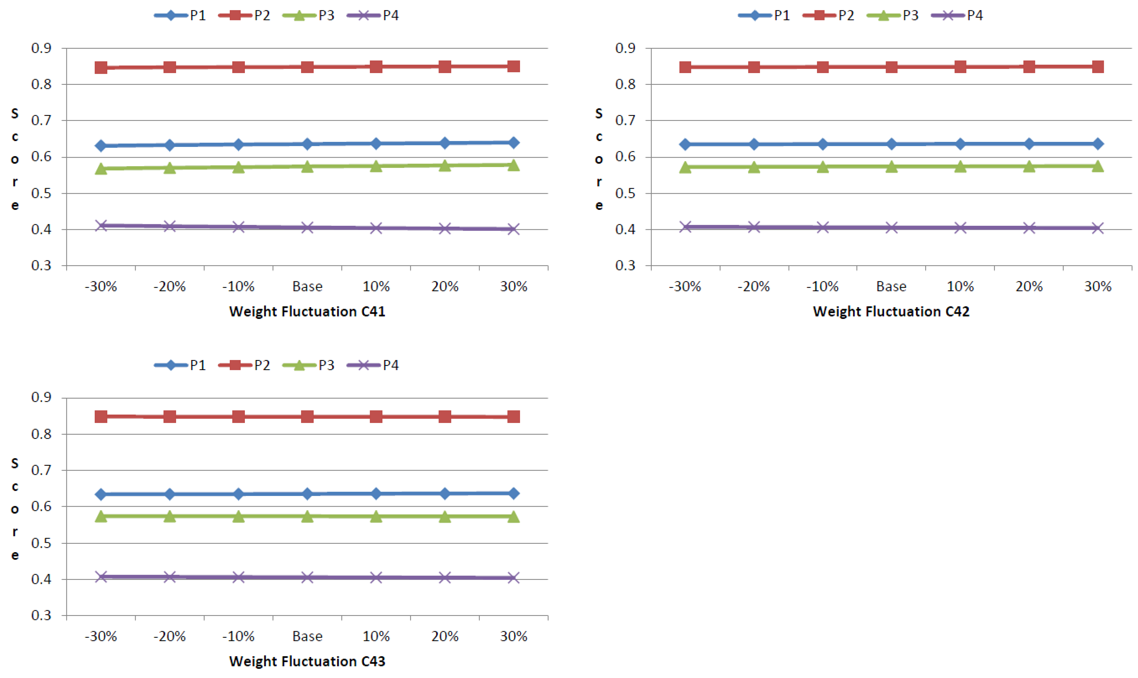 As the policy group holds a relatively small local weight among the initial criteria (Figure 7), when the weights of C41, C42 and C43 change with ±10%, ±20%, ±30%, the variation is not very obvious, which implies the sub-criteria in the policy groups are considered insensitive. Equals to economy, organizational setting and community environment groups, P2 and P4 are always the optimal and worst choice regardless of sub-weights in the policy group flucate.