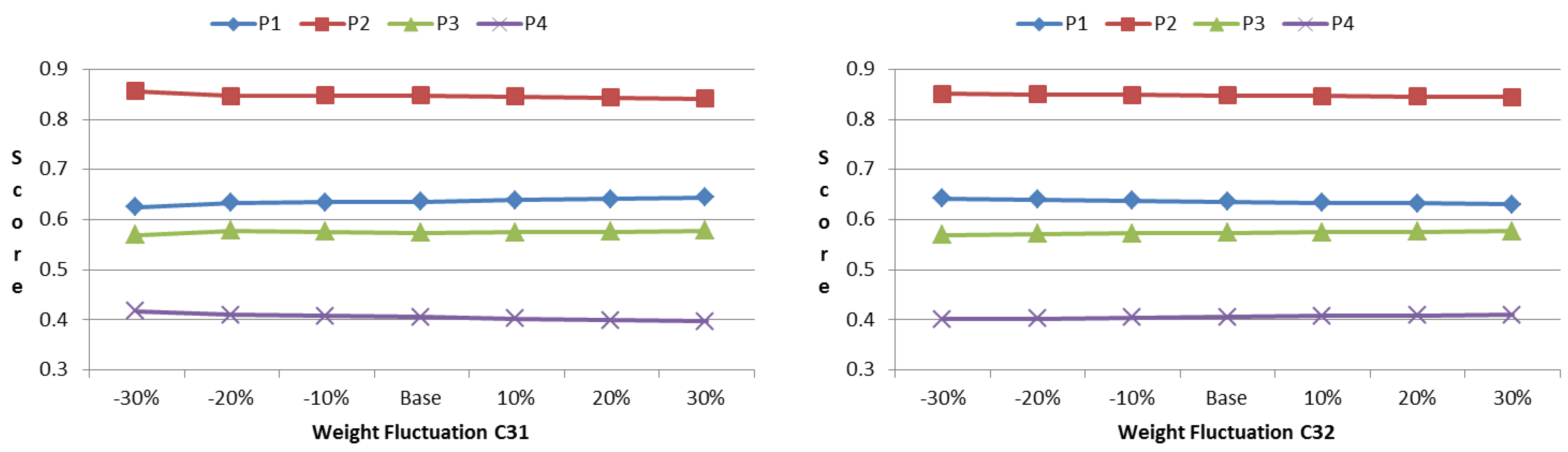 Figure 6 shows the weight fluctuation of C31 and C32 in the community environment group. The scores of all the community-based LTC programmes hold a small variation trend, though the fluctuation of P1 and P3 entails a more conspicuous decrease when the weight of C31 becomes less important. The ranks of the alternatives remain consistent with the base situation.