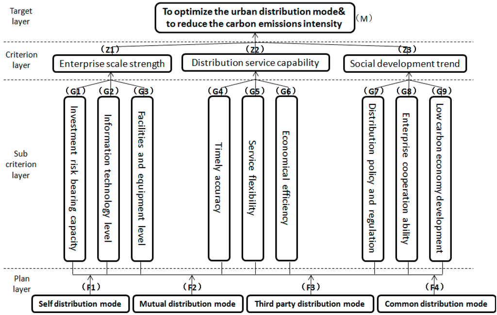 First, make the decision objective clear. The reduction of total energy consumption, total carbon emission and total cost are not the decision objective proposed in this paper. Instead, the decision objective is to choose the best urban distribution mode and reduce the carbon emissions intensity of urban distribution. On one hand, based on the full understanding of all aspects, enterprises personnel re-examine the relative importance of the pair wise of the influencing factors, which realizes the re-judgment and adjustment of enterprises. On the other hand, we compare the carbon emission intensity before and after the selection, and test the low carbon contribution of the distribution mode. In summary, the decision target of the selection method proposed in the paper includes two aspects.