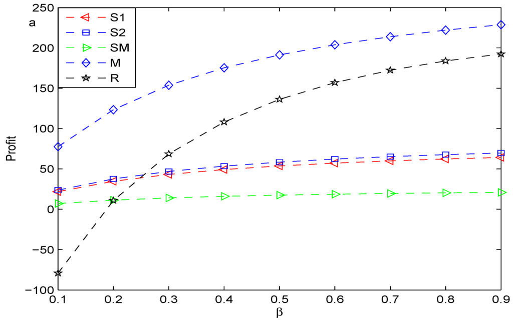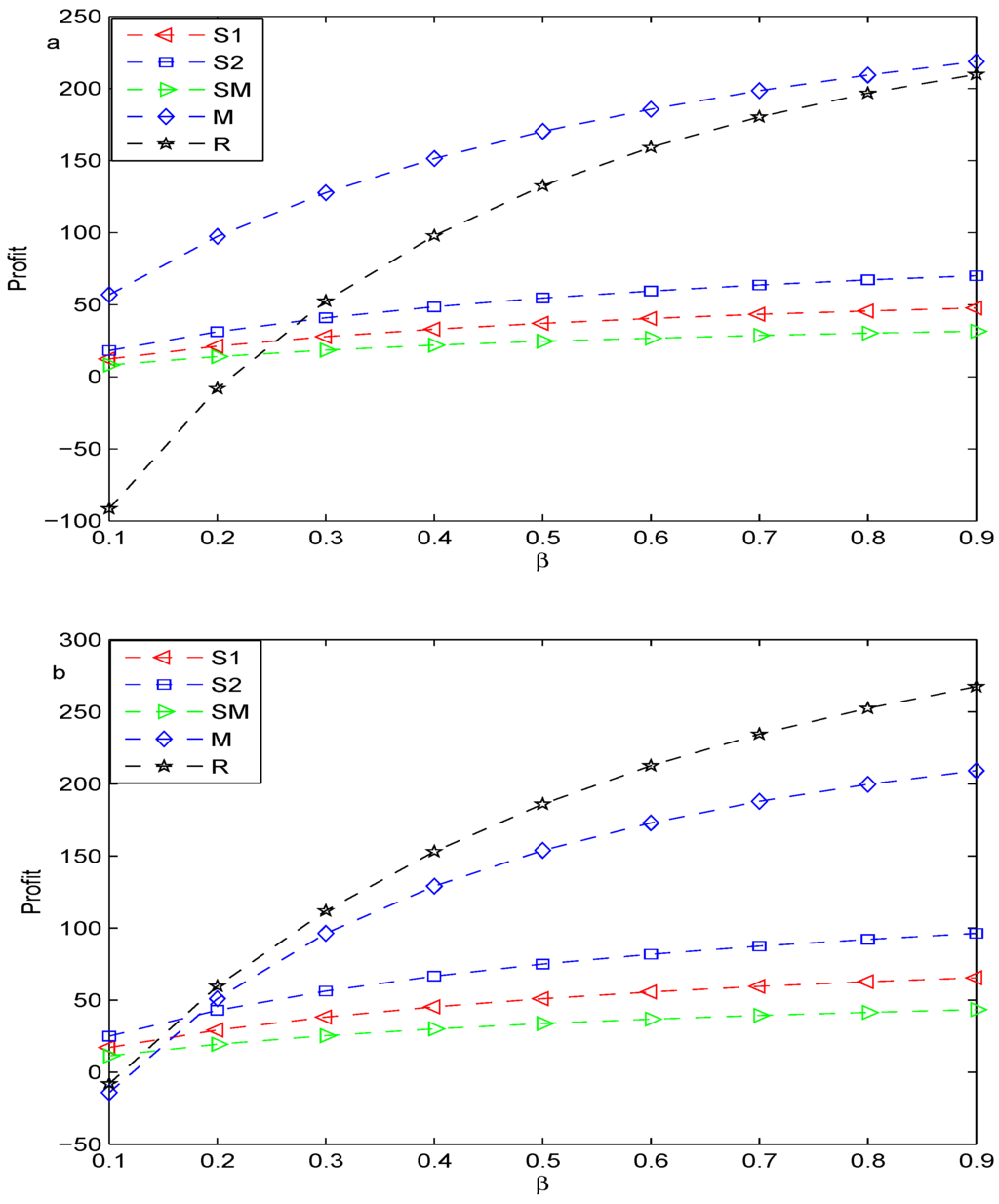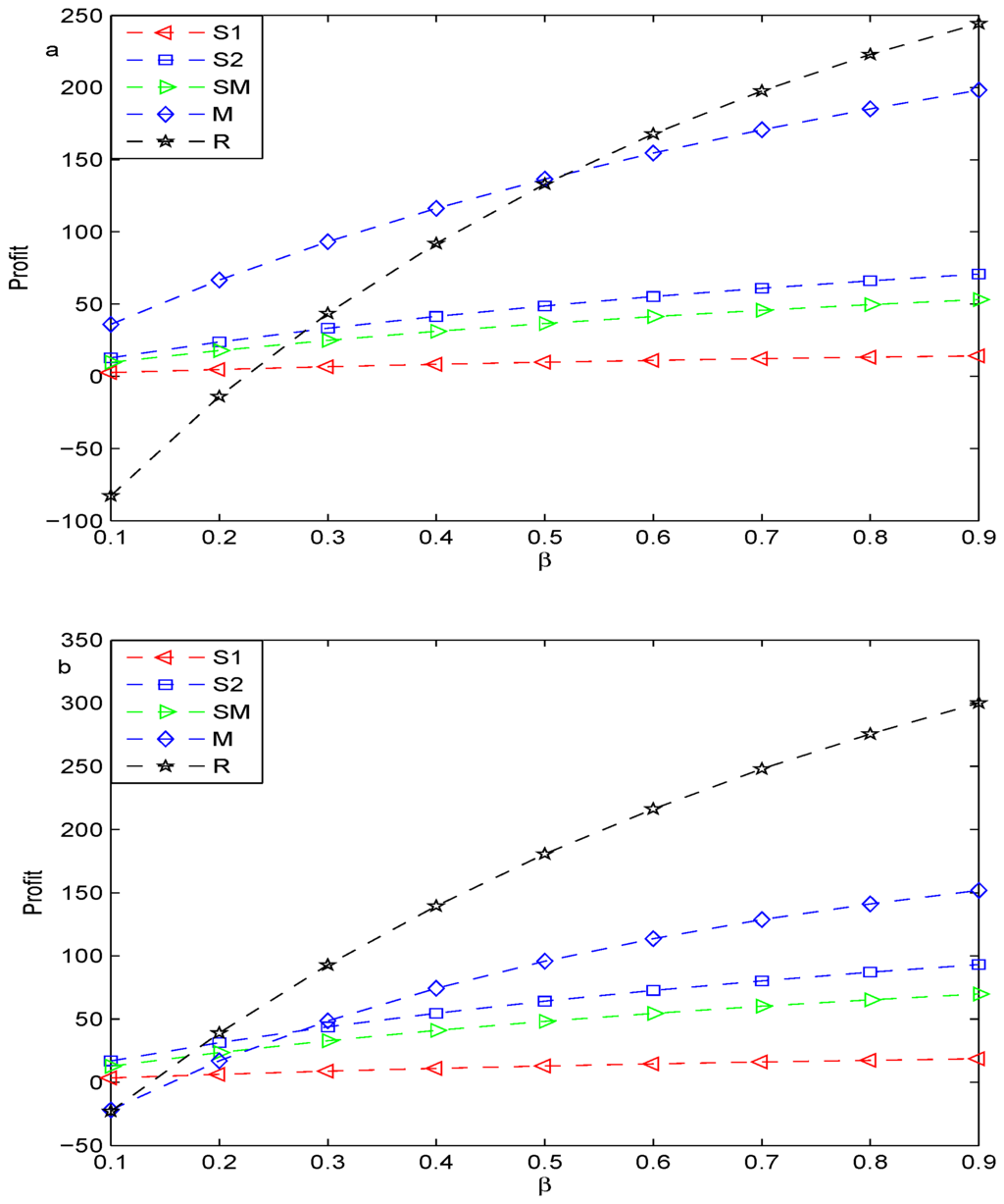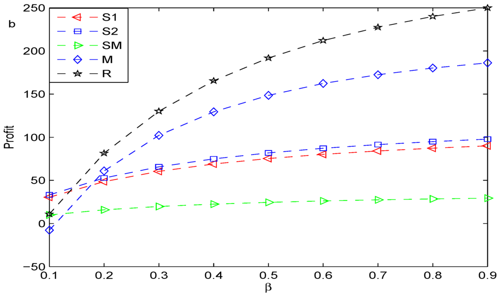 Denote the retailer’s maximal profit, the manufacturer’s, the spot market’s, and the maximal profit of the supplier by R, M, SM and Si, respectively. Figure 2, Figure 3 and Figure 4 compare the maximal profit of each member under wholesale price contracts with that under buy-back contracts in the decentralized supply chain when , respectively. We find that coordination can enhance each member’s profit, except the manufacturer’s. As the probability of substituting product for product A increases, the maximal profit of each member increases in the sense of both wholesale price contracts and buy-back contracts.