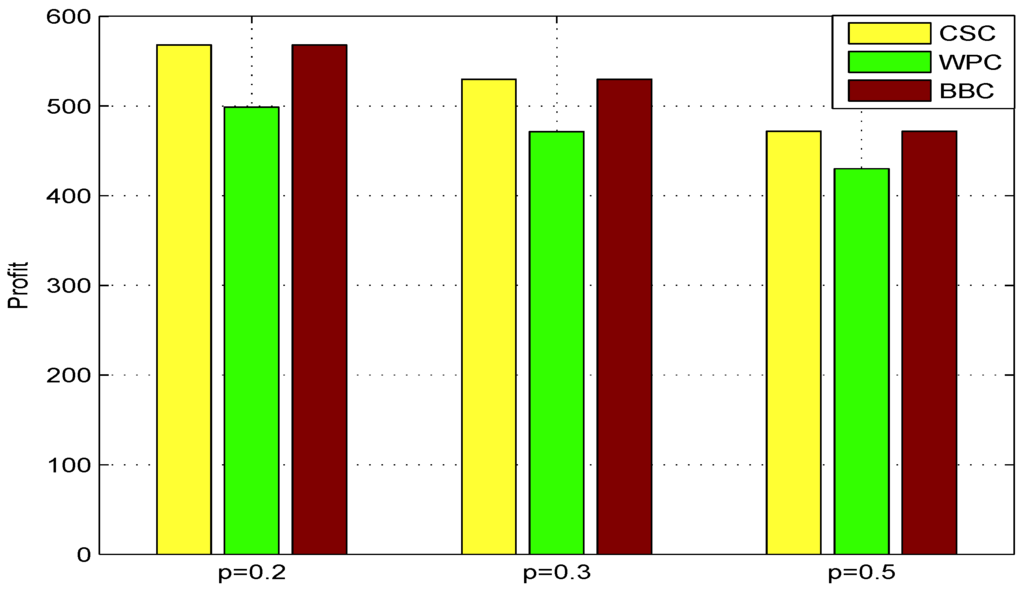 Comparison of the channel profit in three case of the centralized supply chain (CSC), the wholesale price contract (WPC) and the buy-back contract (BBC) when .