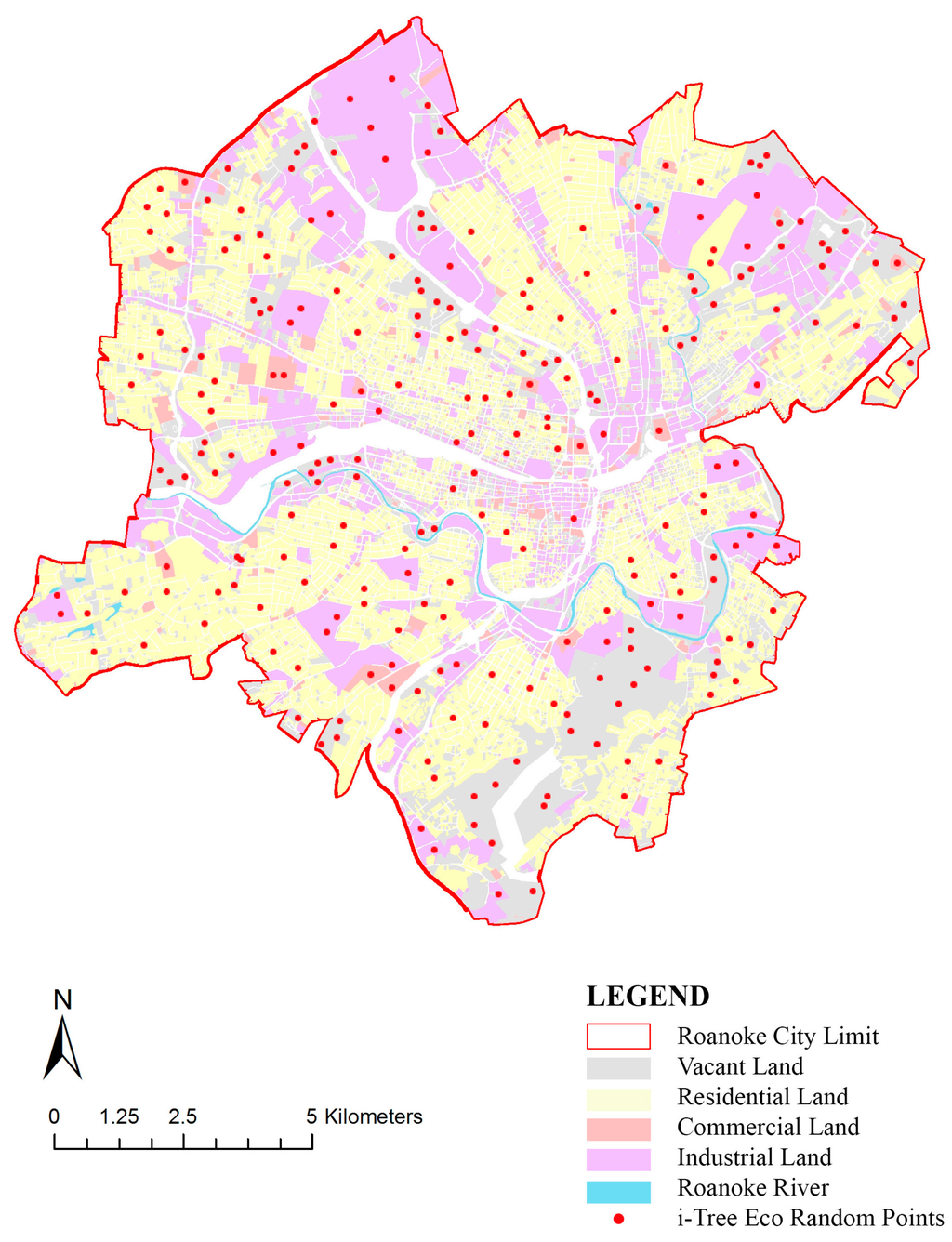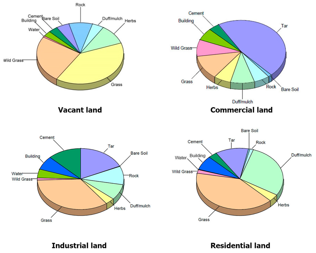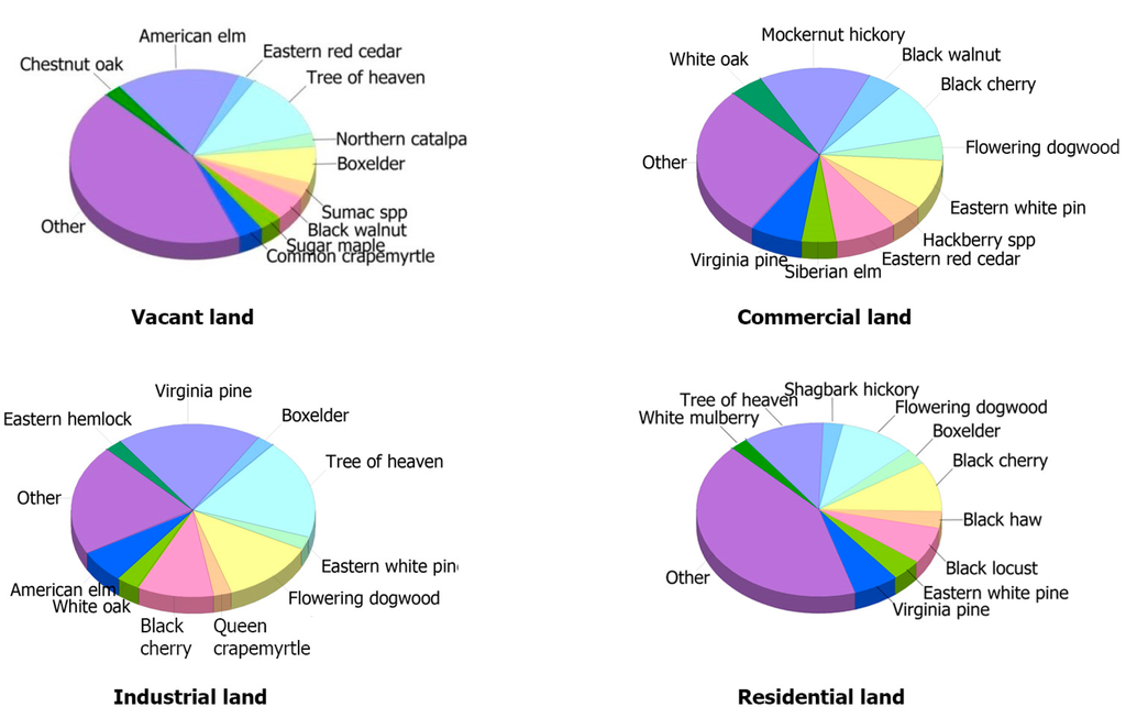 To compare the ecosystem services provided by vacant, commercial, industrial, and residential land, an additional 137 0.04 ha plots were measured using a stratified random sample across three land use types: commercial (14 plots), industrial (40 plots), and residential (83 plots) during 2012 using the standard i-Tree Eco sampling protocols. Plots were assigned proportional to the tree canopy cover and land area within each stratum based on existing canopy data and land use zoning (Figure 1) [30].