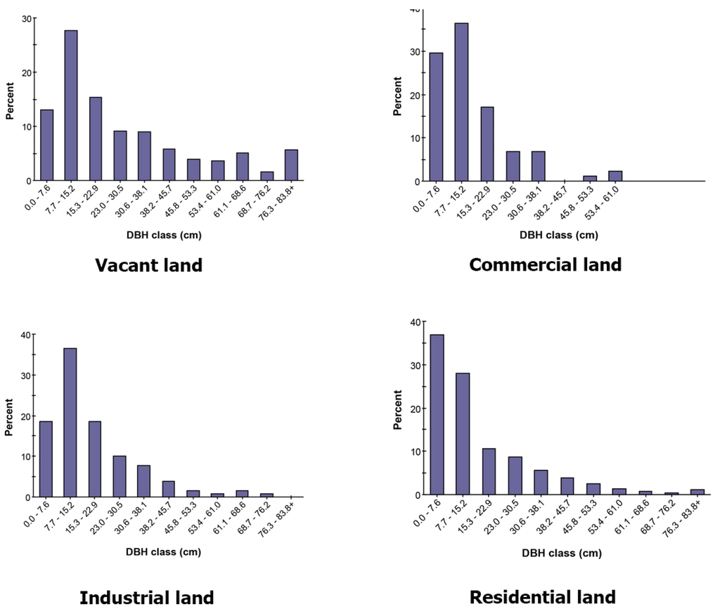 Percentage of tree population by diameter class for each land use type (dbh = stem diameter at 1.37 m above the ground line). Trees growing on Roanoke’s vacant land with diameters less than 15.2 cm constitute 40.8% of the tree population.