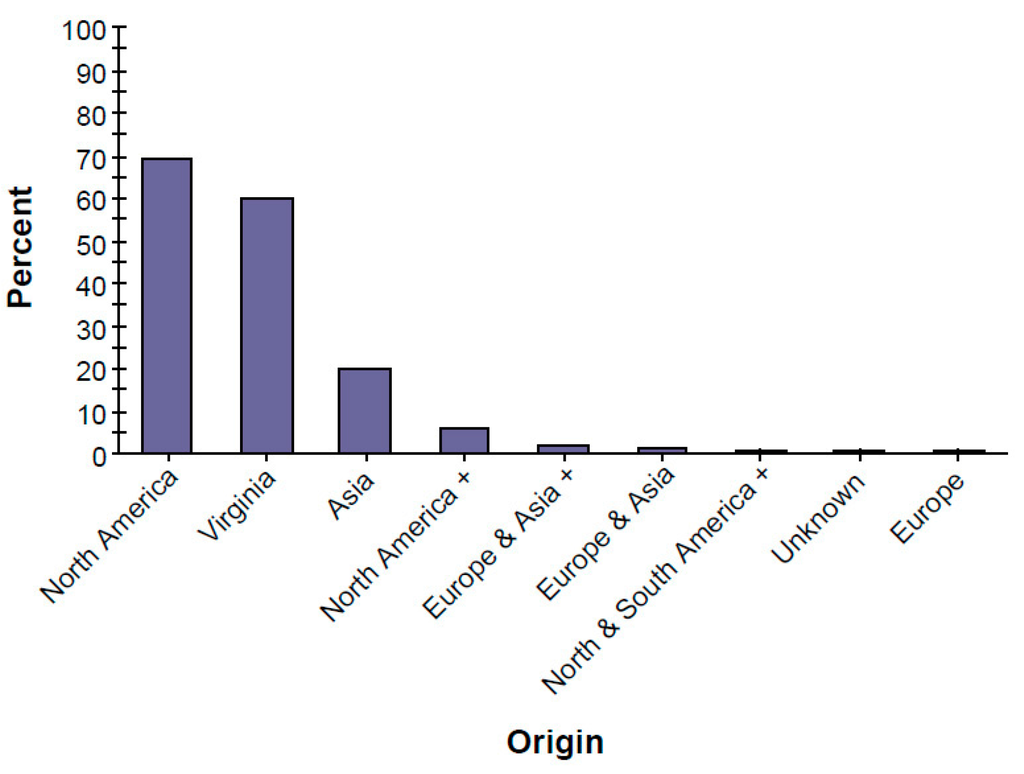 About 69% of the trees growing on Roanoke’s vacant land are species that are native to North America, and 60% are native to the state (Figure 4). Exotic species from outside North America make up 31% of the population. Most of Roanoke’s vacant land exotic tree species are indigenous to Asia (20.2% of the species).
