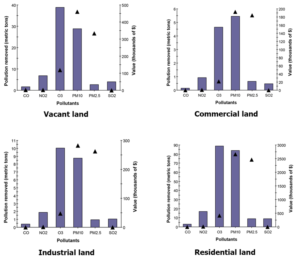 Pollution removal (bars) and associated economic value (▲) for trees on land use, City of Roanoke, Virginia. Pollution removal value was calculated based on the following prices: $1252 per metric ton (CO, carbon monoxide), $3048 per metric ton (O3, ozone), $315 per metric ton (NO2, nitrogen dioxide), $112 per metric ton (SO2, sulfur dioxide), $15,984 per metric ton (PM10, particulate matter less than 10 microns and greater than 2.5 microns), $124,499 per metric ton (PM2.5, particulate matter less than 2.5 microns). Pollutants are CO, NO2, O3, PM10, and SO2.