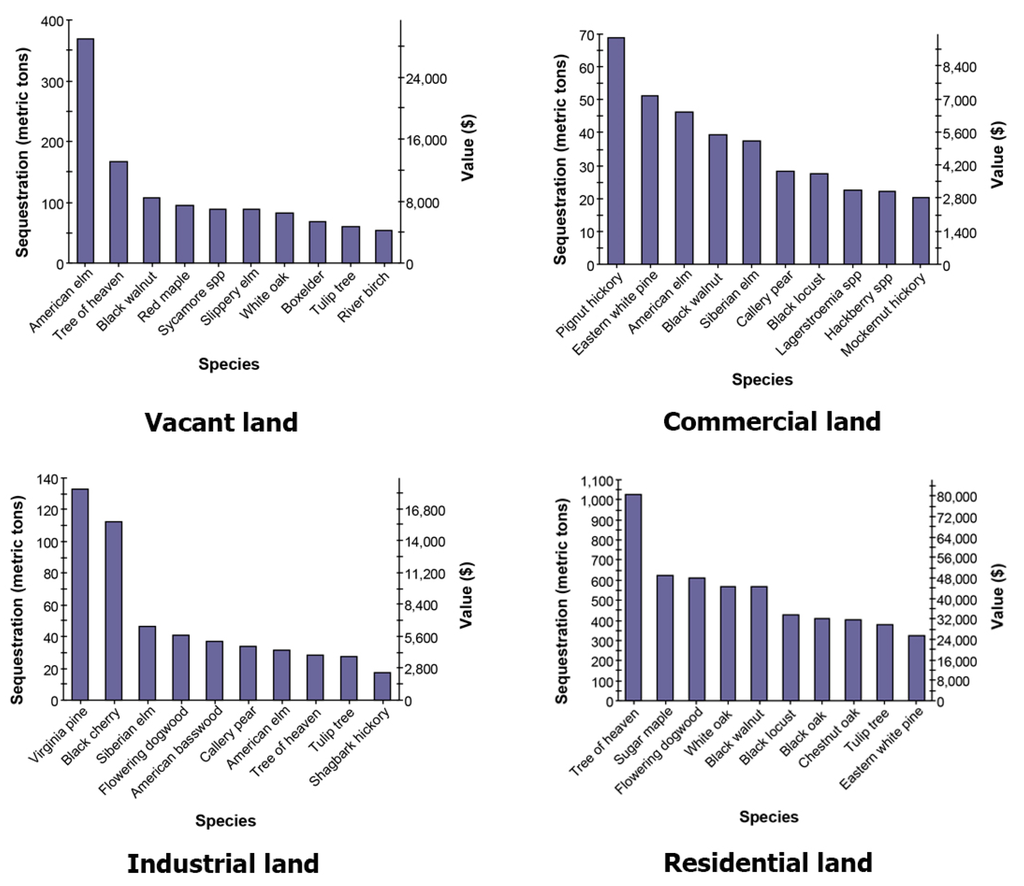 Carbon sequestration and value for species with greatest overall carbon sequestration in Roanoke for each land use type. Among the tree species, the American elm captures and reduces the most carbon (approximately 19% of the total carbon stored and 18.8% of all sequestered carbon).