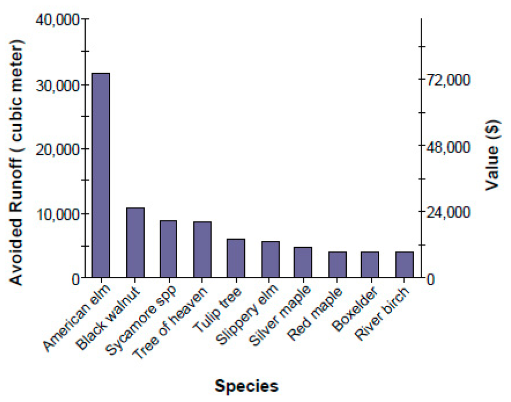An importance value (IV) over 10 for certain types of plant may make a patch of land over-reliant on a particular species for structural and functional benefits, depending on the local ecosystem. The functional benefits considered in this study included the air pollution removal value, carbon sequestration and storage, avoided runoff, energy saving, and structural value of trees on vacant land. Structural values are based on the valuation procedures developed by the Council of Tree and Landscape Appraisers, which uses tree species, diameter, condition, and location information (e.g., the cost of having to replace a tree with a similar tree) [25]. Roanoke’s vacant land has four species with an IV exceeding 10, the most important of which is the American elm with an IV of 42.6. The 10 most important species of trees growing on vacant land in the city are listed in Table 3.