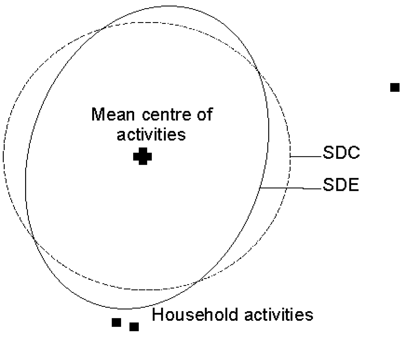Buliung and Kanaroglou [120] have generated a standard distance circle (SDC) using standard distance (SD) of activity locations as radius centred on the mean centre of activity locations (Figure 1). Using the SDC measure, they have shown that the size (area) of activity spaces for sub-urban households are more dispersed than urban households. A similar method has been used by McCray and Brais [83]. This found that women who own cars have a greater size of activity spaces than non-car owners. They have also reported that home location from transit route influenced the size (area) of the SDC for the non-car user. Although the SDC suggests a dispersed or clustered pattern of activity spaces with a measure of areal extent, it cannot be used to investigate orientation or shape of the activity spaces [118]. Buliung and Remmel [123] have indicated that individual activity spaces are likely to possess these properties due to heterogeneity in the spatio-temporal distribution of activity destinations, and the spatial structure of road networks.