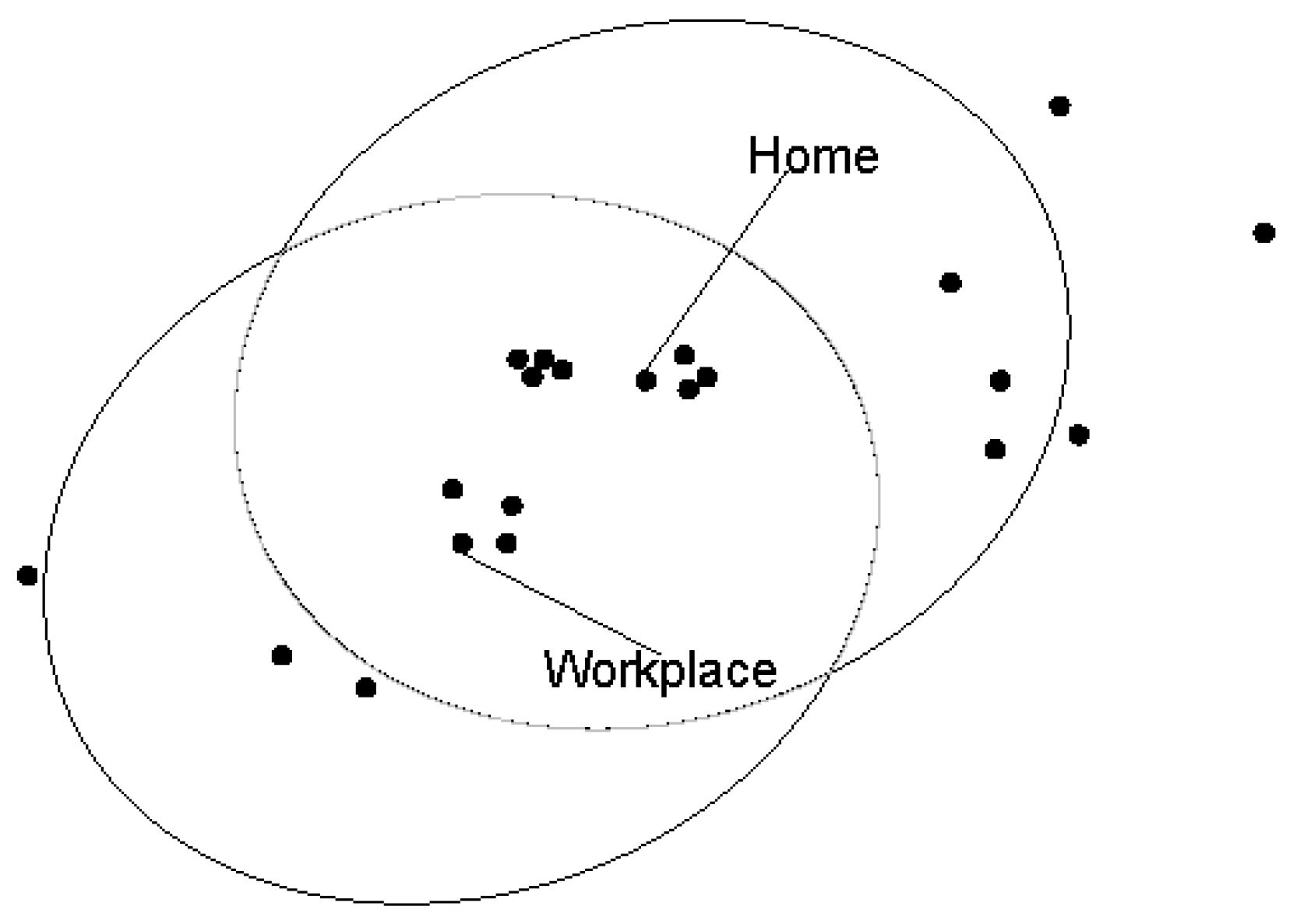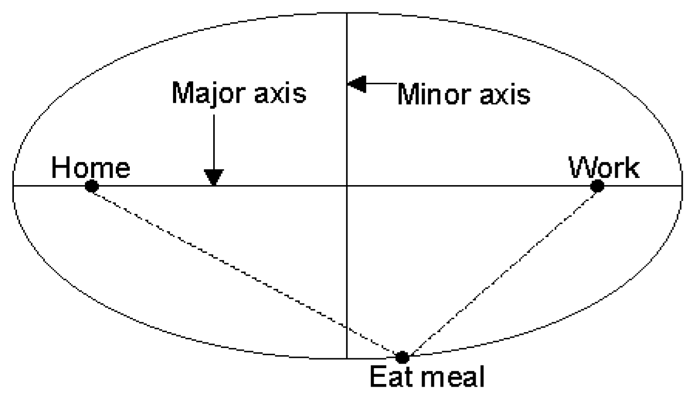 Standard deviational ellipse (SDE) provides a unique approach to getting around this problem (Figure 1). It graphically represents the shape and direction of activity spaces on the one hand. On the other hand, the area of the ellipse represents the spatial extent of the activity spaces [121]. Ellipse-based measures have been used to compare the dispersion between travellers [108]. Since the SDE is centred on a single point (the mean centre or any exogenously defined centre of gravity), much of the area inside an ellipse contains no activity points [123]. Schönfelder and Axhausen [84] have overcome the problem by creating and merging two ellipses centred on two pegs, such as home and office (Figure 2). However, the elliptical shape has been lost after merging the ellipses. Newsome et al. [121] have proposed a practical approach to overcome this problem. Instead of drawing two ellipses, they have drawn a single ellipse using the distance of the furthest activity location amongst the discretionary activities from the foci of the ellipse (Figure 3). The foci represent the pegs (e.g., home and work). Therefore, all other activities remain within the ellipse. The ellipse then represents an inner limit of potential opportunities over which an individual is able to engage in activities. They have quantified their ellipse construct in two ways. Firstly, the ratio of the minor to major axis indicates the fullness of the ellipse representing the relative extent to which the traveller is willing, able, or required to deviate from the main travel route. Secondly, the area of the ellipse represents the size of the activity spaces. They have linked the outcomes of these measures with travellers’ characteristics and have found this potentially useful in understanding travel behaviour.