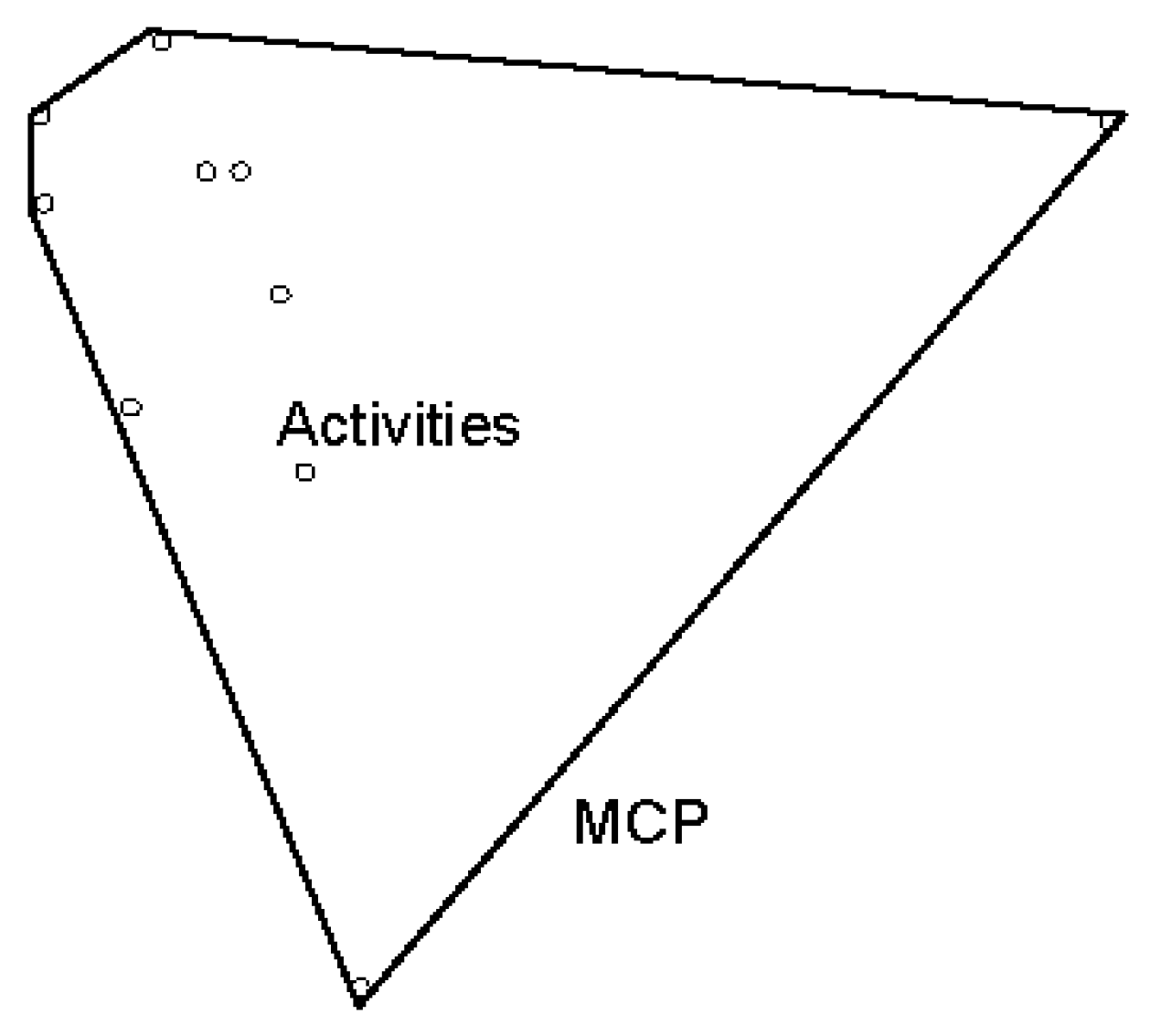 Minimum convex polygon (MCP) based measure has recently been introduced into travel behaviour research (Figure 4) [118,120]. It was first introduced in the ecology literature in the late 1940s as an approach for measuring animal home-range [124]. With respect to human travel behaviour, the MCP is the smallest convex polygon containing all activity locations of an individual [108]. It provides a basic measure of the area or maximal geographical extent of the activity space on the one hand. Visually, on the other hand, the MCP provides a generalised depiction of the shape of activity spaces. Buliung et al. [108] have mentioned that the MCP is a supplementary measure of traditional area-based measures (e.g., ellipses), and have used the measure to explore weekday-to-weekend and day-to-day variation of travel behaviour. Using the MCP measure, Buliung and Kanaroglou [120] have shown that the size of activity spaces varies between CBD-based households and sub-urban households. Using a similar concept, Rogalsky [122] has created a polygonal generalised travel area using the origins and destinations of all trips for working, poor, single mother living in Knoxville. This work found that individuals with mobility constraints had smaller sized of activity spaces than others.