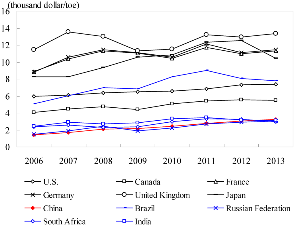 In Figure 5, the energy efficiency levels in most countries have improved. Specifically, in typical developed countries (black lines in Figure 5), the United Kingdom had the highest energy efficiency level. For example, in 2013, 1 toe input can output $13,350 in United Kingdom. Meanwhile, the energy efficiency in Europe was generally higher than that in North America. The energy efficiency in Japan had a similar level with Europe’s. Although China’s energy efficiency level had improved in recent years, there was a large energy efficiency gap between China and developed countries. In terms of the developing countries in BRICS (blue lines in Figure 5), their energy efficiency levels were relatively lower than those in developed countries from 2006–2013. However, Brazil reached a high energy efficiency level, which has benefited from the greater use of alternative and clean energy resources, such as natural gas and ethanol fuel. In Brazil, 90% of cars are driven by ethanol fuel, reducing 80 million tons carbon dioxide emissions from 2003–2009. China has a similar level of energy efficiency compared with the Russian Federation, South Africa, and India, which rises steadily, but still has much space for improvement.
