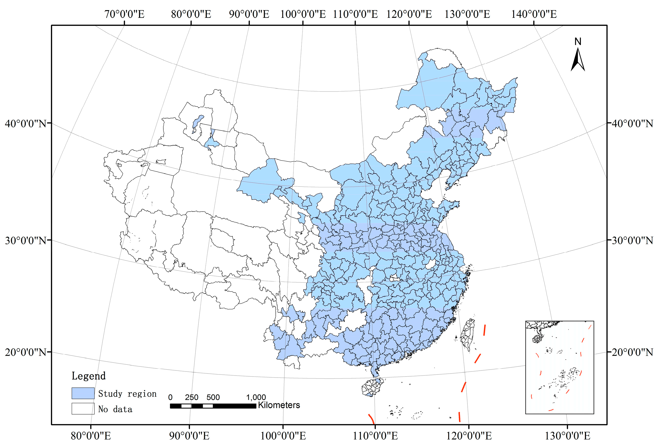 According to the explanation about accelerating the construction and development of urban agglomerations in “The Thirteenth Five-Year Plan for National Economic and Social Development of the People’s Republic of China”, 19 urban agglomerations will be built in China. Cities in the study region are distributed into 17 of those urban agglomerations: the Yangtze River Delta, the Pearl River Delta, Beijing-Tianjin-Hebei, Middle Yangtze River, Chengdu-Chongqing, Shandong Peninsula, Hachang, Mid-southern Liaoning, West Taiwan Strait, Guanzhong, Central Plains, Beibu Gulf, Hu-Bao-E-Yu, Jinzhong, Lanzhou-Xining, Dianzhong and Qianzhong.