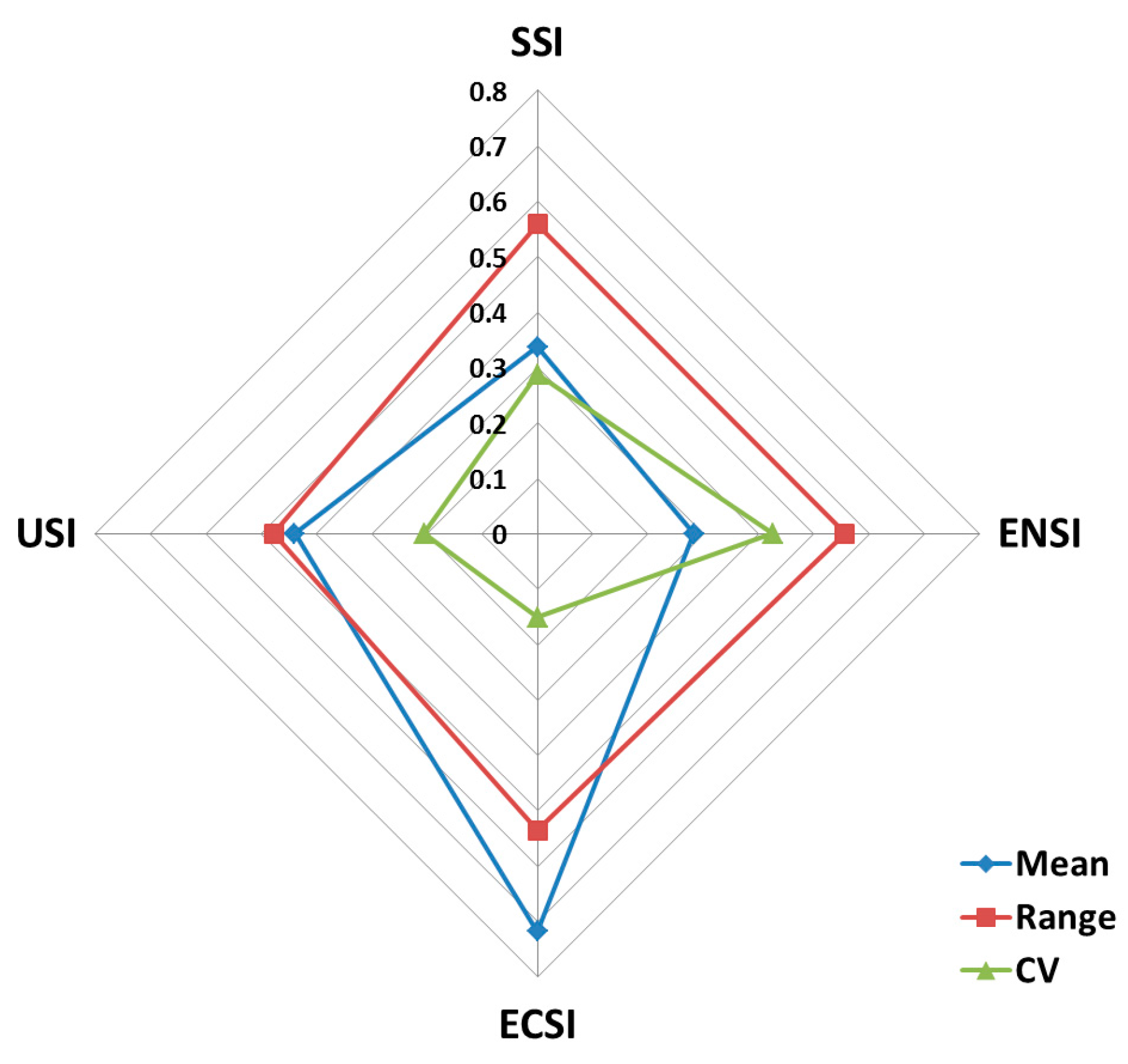In Figure 2, combined with the grading range of mean values (see Table 3, Table 4, Table 5 and Table 7), it can be seen that the performances of ECSI, ENSI and USI rank in the fourth level, except for the results of SSI which ranks in the third level, indicating that sustainable development of both the three dimensions and the overall results are at a relatively low level. Through further analysis of CV, the rank of CV values of evaluation on three sub-indices and the overall results are ECSI > SSI > USI > ENSI. The disparity of the economic sustainability of cities is larger than that of the other two dimensions and the overall sustainability.