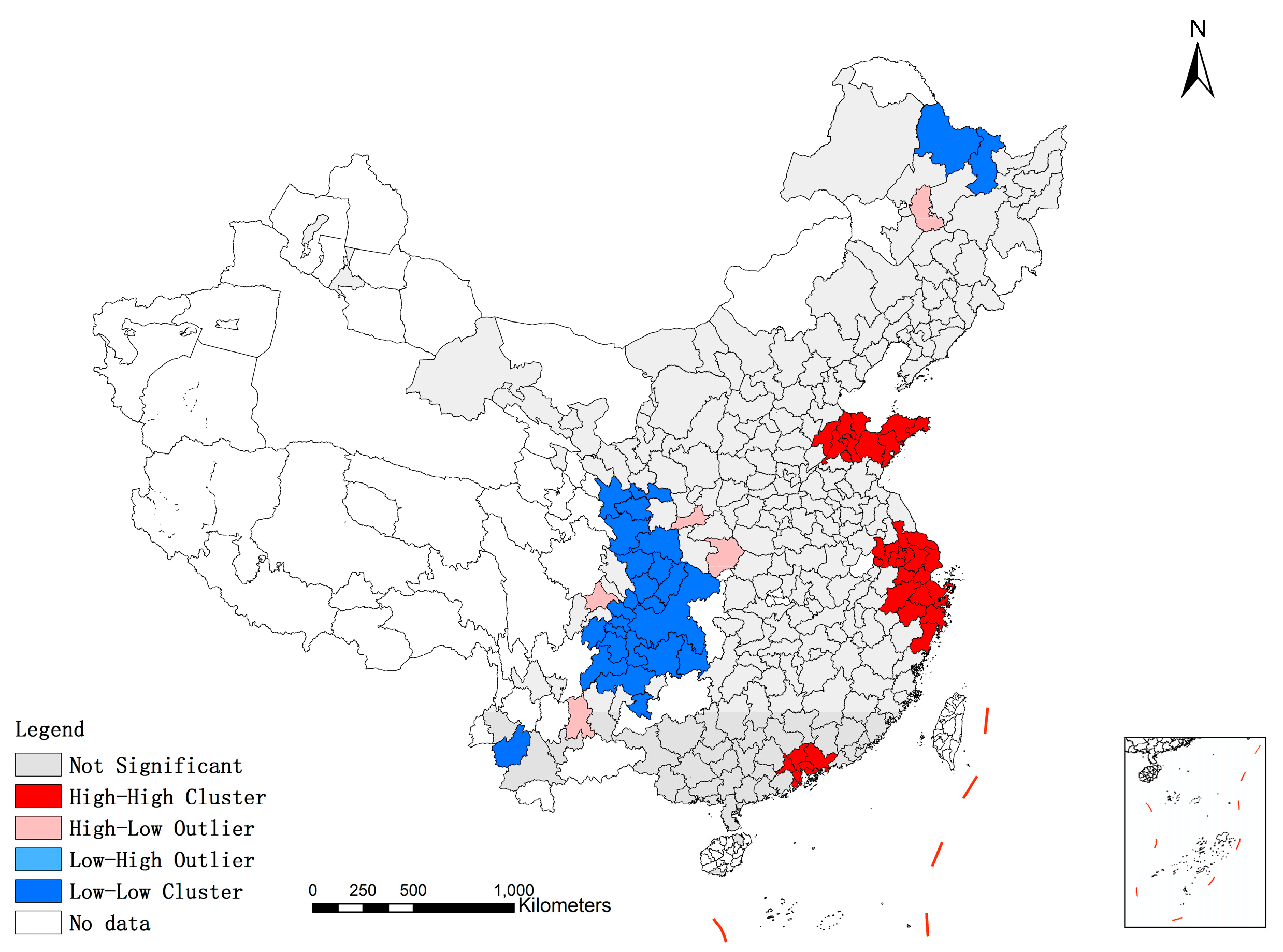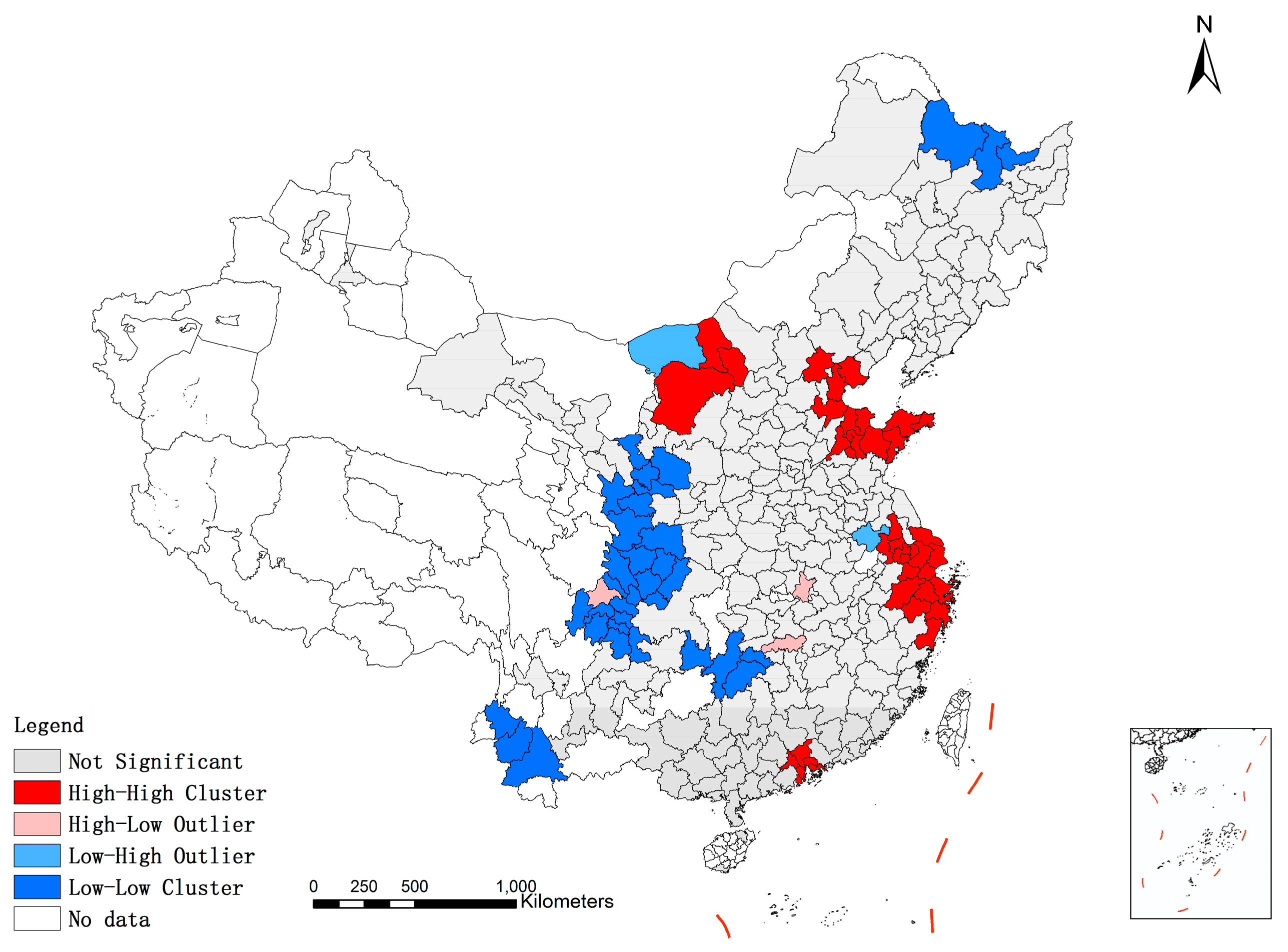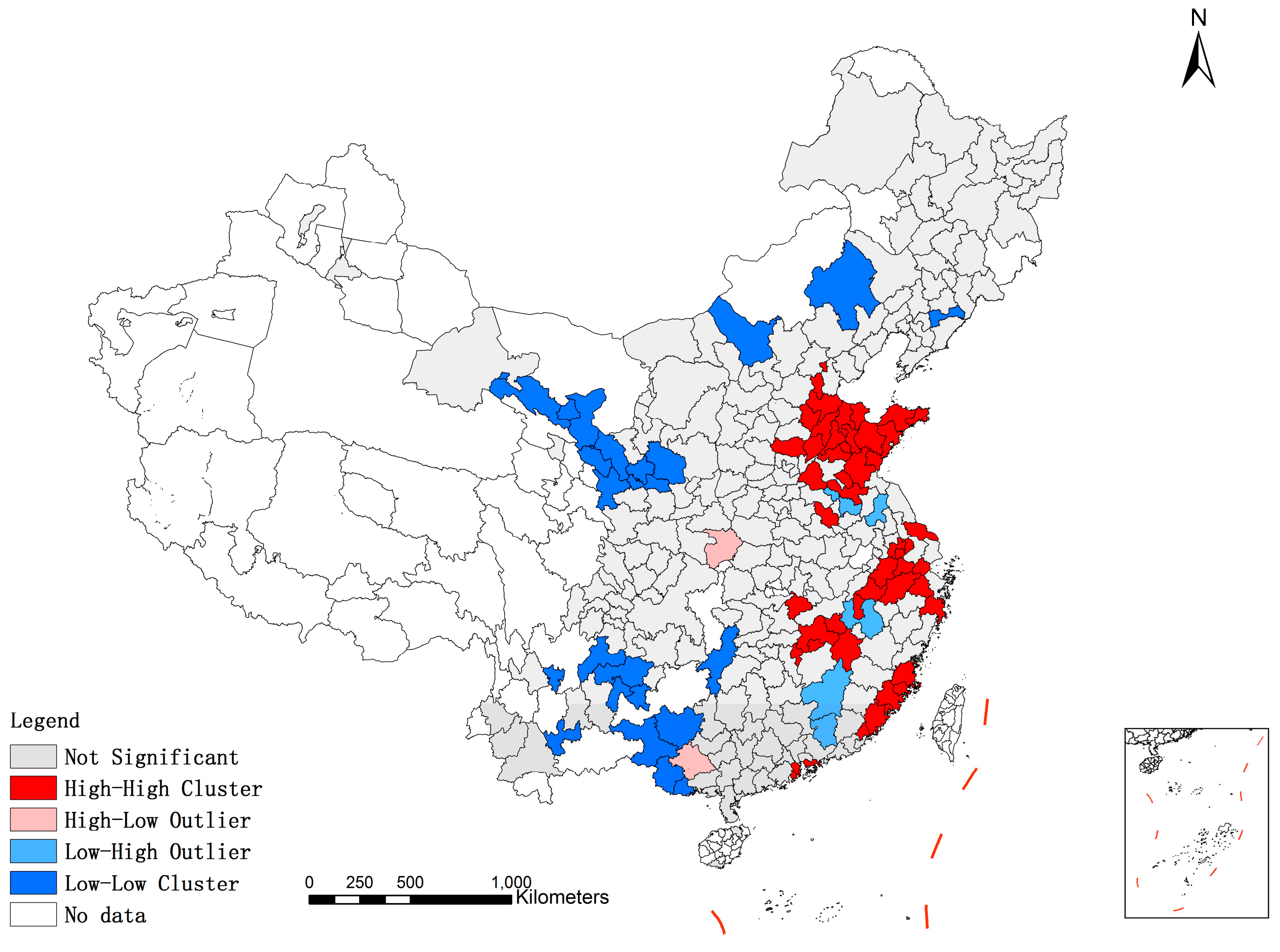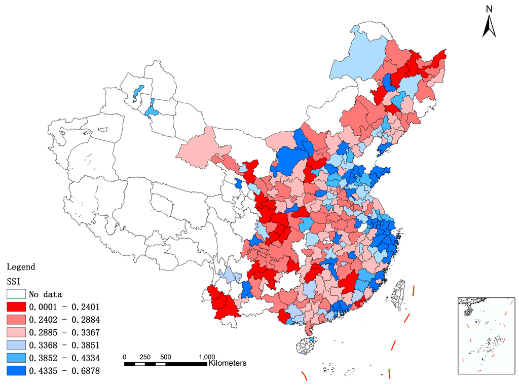 According to Figure 3, it can be seen that there are considerable differences of social sustainable development level among cities in the study region. Cities in the eastern coastal areas of China are at a relatively good level of social sustainable development (areas with blue color), such as cities in Zhejiang, Shandong, Fujian and Guangdong province, while cities in central and west China are at a disadvantage (areas with red color), covering much of the study region.