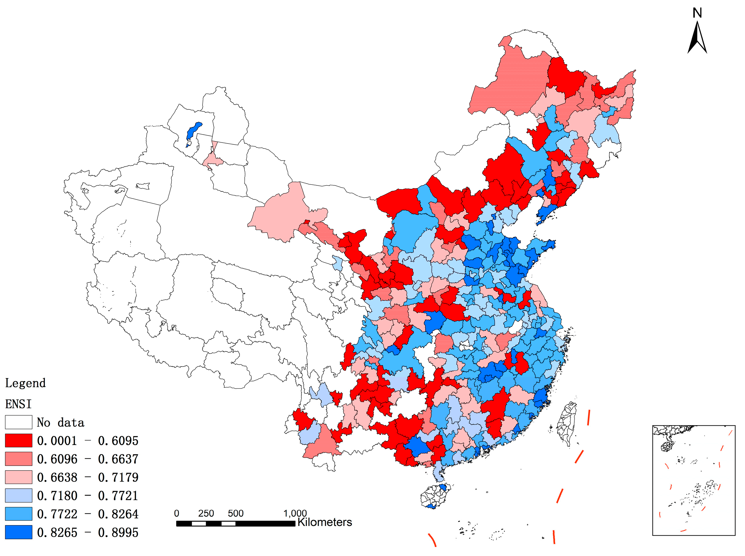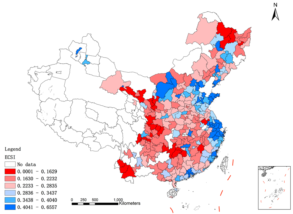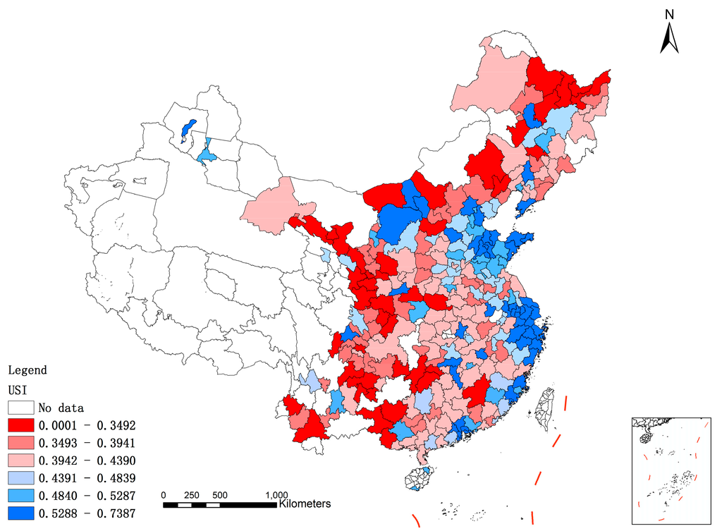 The evaluation results of SSI, ECSI, ENSI and USI can be divided into six grades using the average value μ and the standard deviation σ. Specifically, from Level 1 to Level 6 (from the best to the worst levels), the thresholds of evaluation results are, respectively, μ + σ, μ + 0.5 × σ, μ, μ − 0.5 × σ and μ − σ. Specifically, from Table 3, the total number of cities at Levels 1–3 is 117, whereas 10.45% of cities are at the worst position, including cities in Gansu, Yunnan, Guizhou, Sichuan, Heilongjiang, etc.