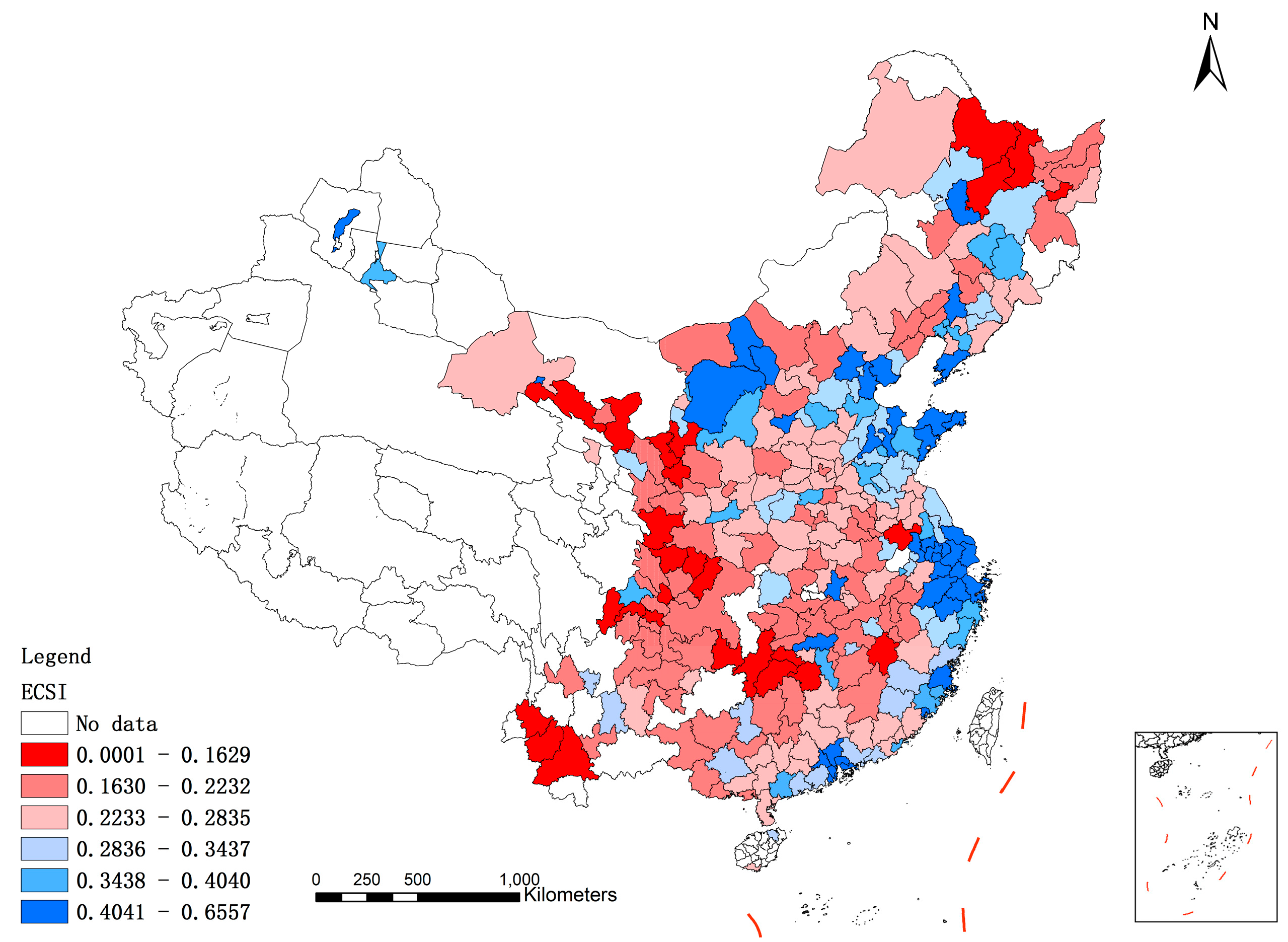 Grade map of evaluation results of ECSI for cities.