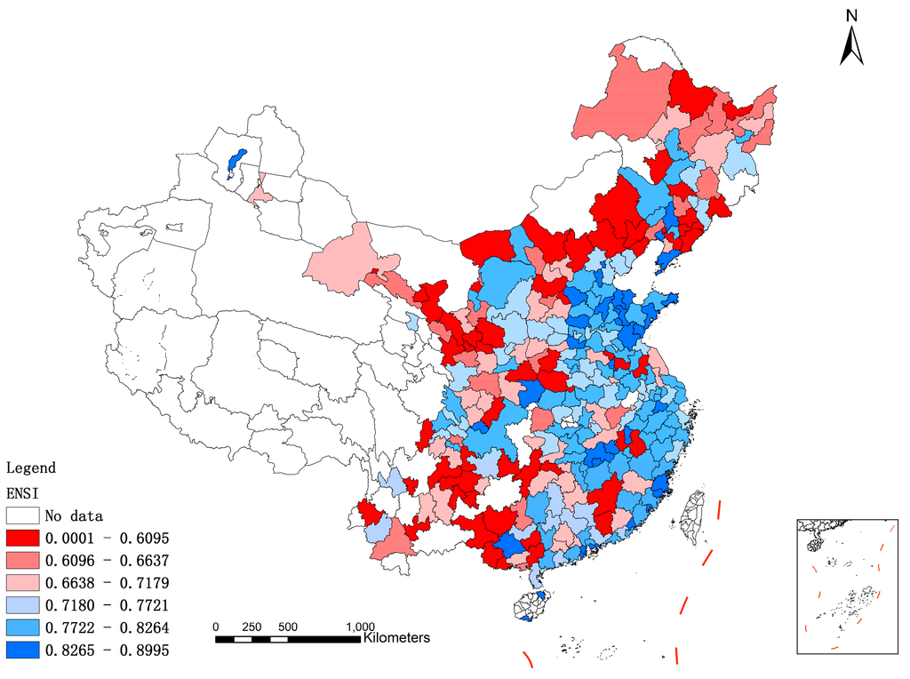 As shown in Figure 5, cities in southern China have a better performance in environmental sustainability than the northern cities, and cities in the east of China have better environmental sustainable levels than those in the west. Specifically, cities with relatively poor environmental sustainable development are mainly located in Heilongjiang, Jilin, Gansu, Shaanxi, Shanxi, and Yunnan Provinces, while cities in Shandong, Zhejiang and Jiangsu Provinces have better environmental sustainable conditions. In Table 5, the total number of cities ranking in Levels 1–3 is 167, while 54 cities (18.82%) are at the lowest level of environmental sustainable development. Compared with grading results of SSI and ECSI, it is worth noting that more cities are at Level 6 of ENSI and in the worst position of environmental sustainable development. Owing to geographical differences, different regions have correspondingly different natural geographical features, including climate, hydrology, topography, vegetation cover, and resource distribution. At the same time, because of the impact of human activities (different industrial and agricultural productions, and different industrial structure), cities in different regions have environmental differences.