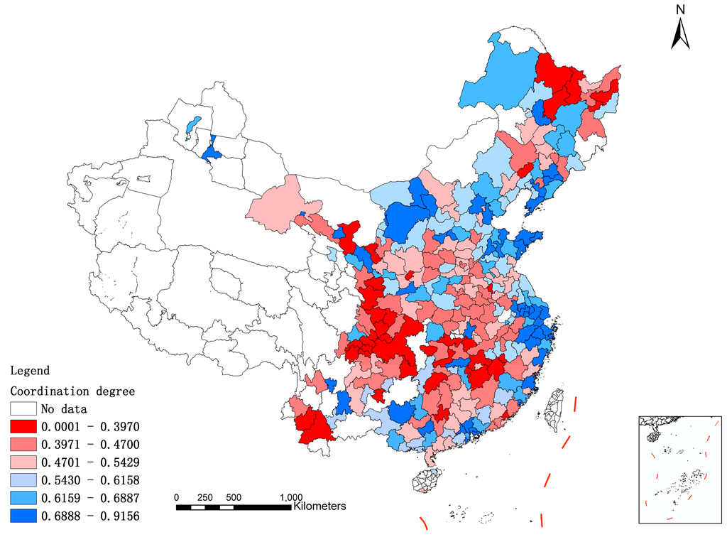 The coordination degree of urban sustainable development can reflect the development coordination level and associated efficiency among society, economy and environment. Based on Equation (14), the coordination degrees of evaluation results of three sub-indices in study region have been calculated. Poor coordination means inconsistency among SSI, ECSI and ENSI, while cities with high coordination degrees are at a stage of synchronous development of society, economy and environment. However, it is worth noting that a high coordination degree of a city does not necessarily mean that it is at a high level of sustainable development, as it could still have greater potential for further sustainable development. According to Table 6, coordination degrees of 152 cities are below the average value, which reveals that the coordination of social, economic and environmental sustainable development in most cities in the study region is poor. Moreover, from the grade map of coordination degree (Figure 6), cities with the highest coordination degrees show dispersed distribution, and include most cities in Zhejiang Province, as well as some cities in Shandong, Guangdong, Hubei, Liaoning, Inner Mongolia, Guangxi, Yunnan and Gansu Provinces.