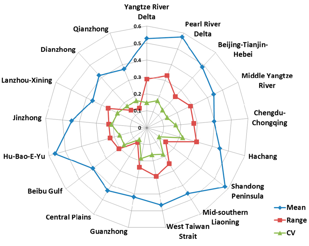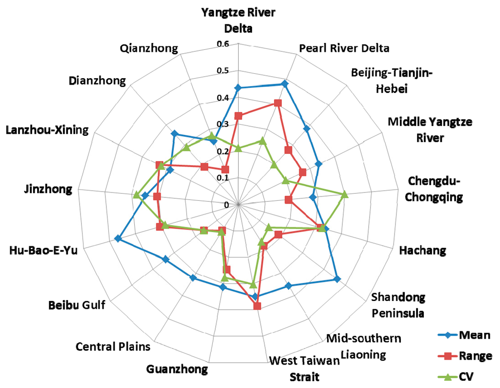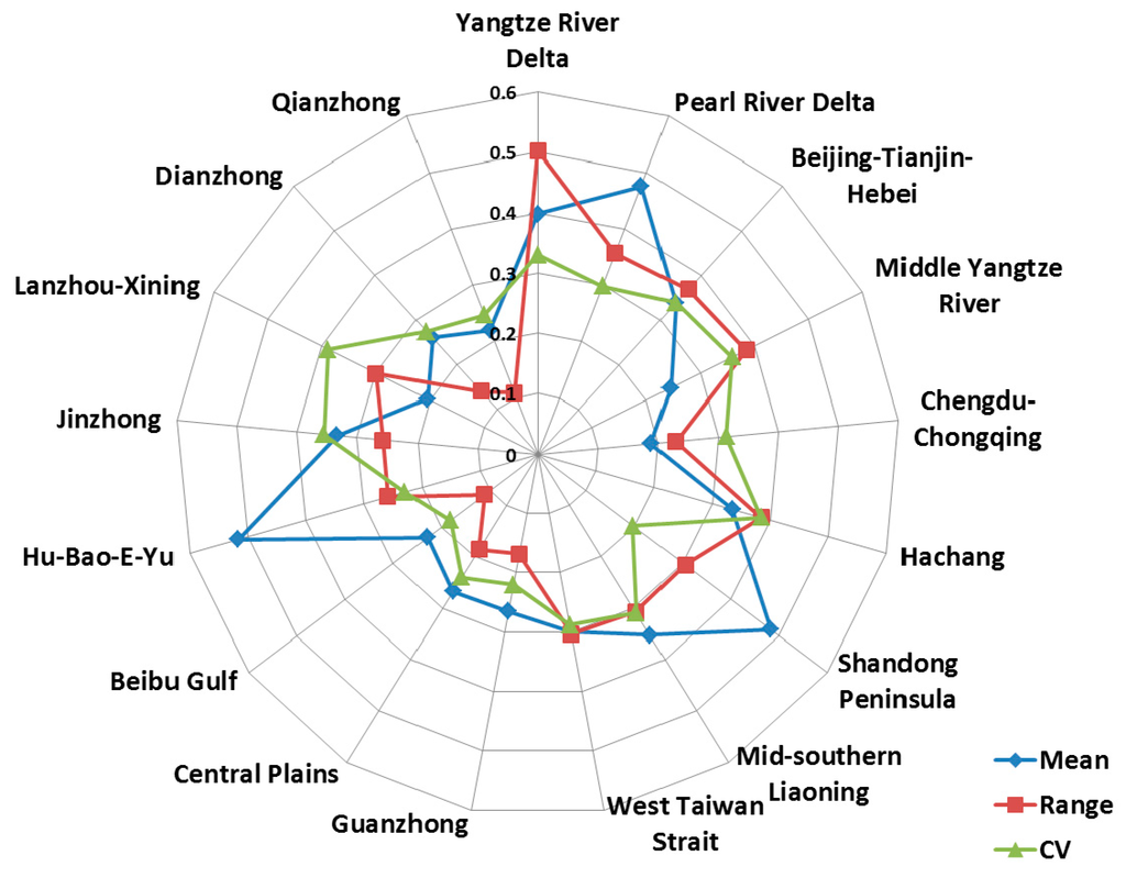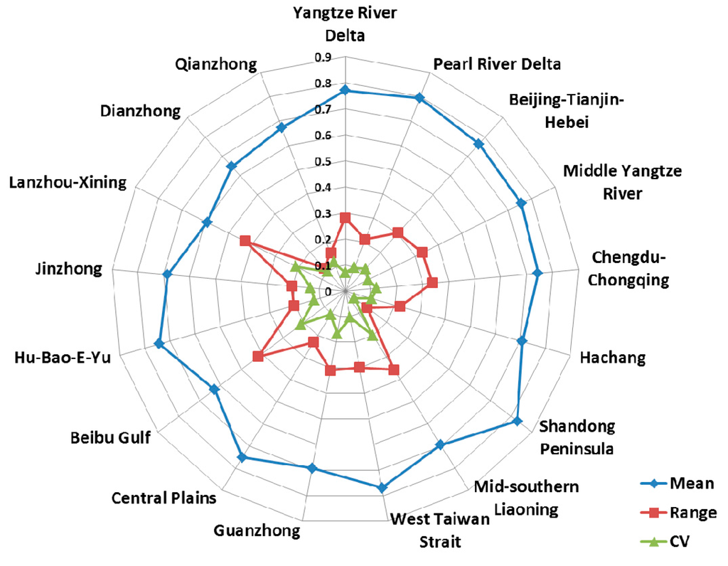 As shown in Figure 8, the top three urban agglomerations in terms of economic sustainable development level are Hu-Bao-E-Yu, Shandong Peninsula and the Pearl River Delta, while Chengdu-Chongqing, Lanzhou-Xining and Qianzhong are listed as the bottom three. Although mean values of evaluation of SSI and ECSI are different, the relative levels of social and economic sustainable development among 17 urban agglomerations are similar, which can be seen from the analogous curves of mean values in Figure 7 and Figure 8, showing the close relationship between social development and economic development. The CV values of evaluation results of ECSI are between 0.1 and 0.4, indicating that all of the urban agglomerations show moderate variability of ECSI. Along with the increase of CV value, the disequilibrium of economic development condition is evident.