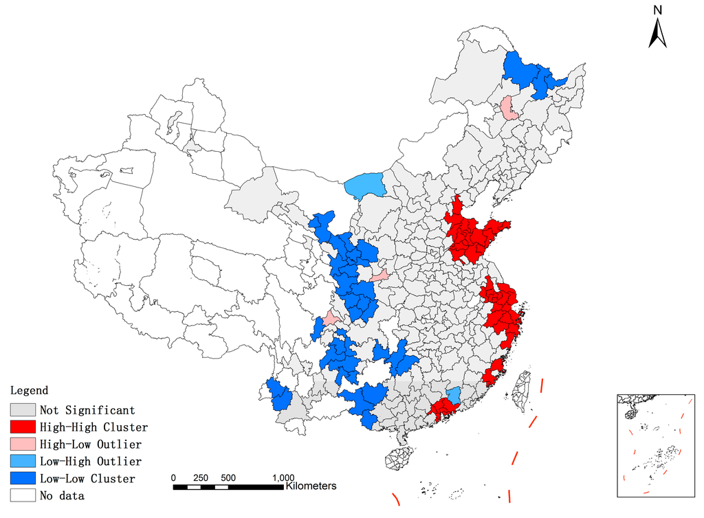 - Anselin, L. Local indicators of spatial association—LISA. Geogr. Anal. 1995, 27, 93–115. [Google Scholar] [CrossRef]