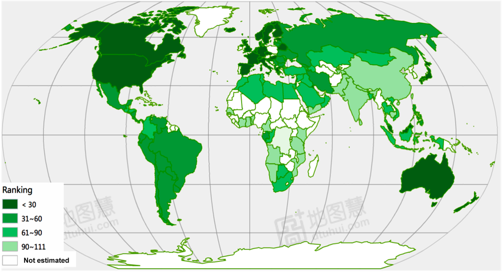 The selected countries in the study can be classified into four groups according to their overall sustainable performance of urbanization: very good countries are ranked between 1 and 30, good are ranked between 31 and 60, poor are ranked between 61 and 90, and very poor are ranked between 91 and 111. Such a classification can be demonstrated in the map of Figure 1.