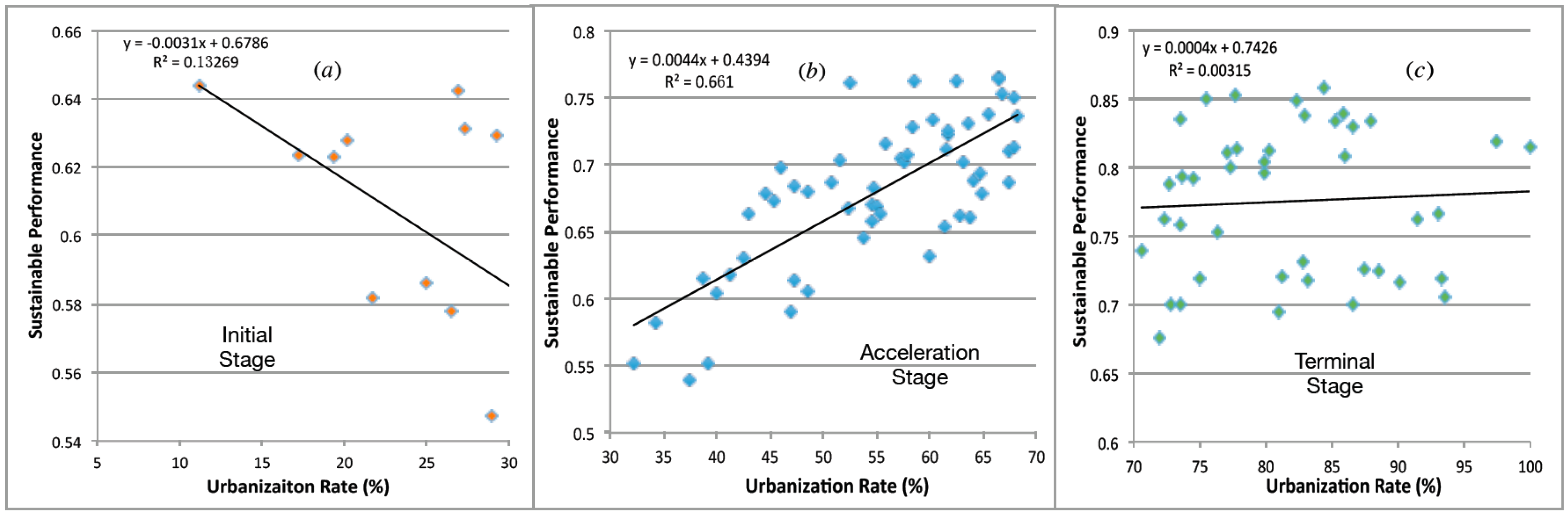 Regression analysis between sustainable performance and urbanization rate at different urbanization stages. (a) The initial stage (b) The acceleration stage (c) The terminal stage.