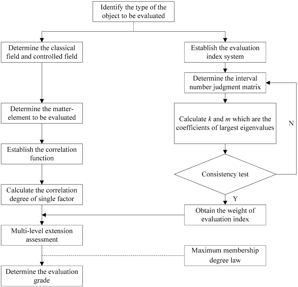 Extension evaluation is one of the important applications of extension theory which was proposed by Cai [22]. Extension evaluation can conduct the qualitative and quantitative analyses by using the correlation function, and determine the rank of the object to be evaluated. However, the traditional extension evaluation is only limited to the evaluation of a single factor. Therefore, when the evaluation object contains a number of indicators and categories, it is necessary to expand the theory of single-factor extension evaluation to solve the problems of multi-factor evaluation. Based on the single-factor extension evaluation, the multi-level extension evaluation method introduces the index weight and can obtain the result of the multi-level extension evaluation of the object to be evaluated according to the maximum membership degree law. The following steps constitute the multi-level extension evaluation method: