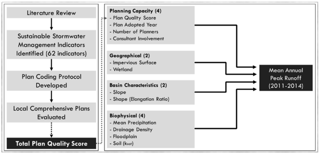 In this study, a conceptual model was developed with two phases to examine the effects of four specific factors (planning capacity, geographical, basin characteristics, and biophysical variables) on mean annual peak runoff (Figure 1). In Phase 1, plan quality score was derived by evaluating whether local jurisdictions in the sample sufficiently integrate the key principles of sustainable stormwater management into local comprehensive plans. A coding protocol for the plan evaluation was developed through the review of the literature associated with stormwater management. In Phase 2, the variance of mean annual peak runoff was analyzed by conducting multivariate regression analysis with four specific variables.