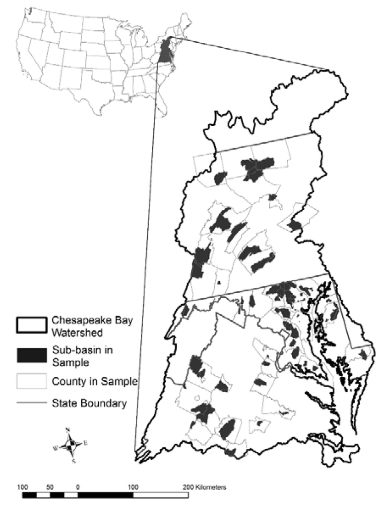 The target population of this study is sub-basins within the Chesapeake Bay watershed. The Chesapeake Bay is the largest and most biologically diverse estuary in North America located in the Mid-Atlantic region [43]. The watershed covers approximately 166,000 km2 and a total of 203 counties and independent cities lie within or adjoining the bay watershed (see Figure 2). The study area has historically been polluted by human developments and impervious surfaces accompanied by rapid population growth. The population in the watershed has doubled between 1950 and 2000 (from 8 to 16 million). This growth has contributed to an impaired bay ecosystem, including habitat loss and water quantity/quality degradation [44]. Approximately 15 percent of the total nitrogen entering the bay originates from urban and suburban polluted runoff, which has been recently recognized as the greatest threat to bay water quality [45].