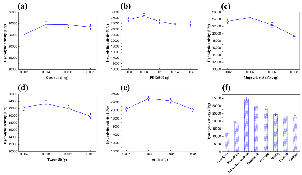 The use of additives has been reported as method to increase the catalytic activity of the lipase. Generally speaking, additives were including in surfactant, protein and salt molecules [12]. Additives such as Tween80 and lecithin can protect the enzyme activity through contact with the enzyme active sites [17,18]. Based on these studies, a series of experiments were conducted with different additives, such as coconut oil, PEG6000, MgSO4, Tween80 and lecithin. The optimized quantities of selected additives were shown in Figure 1a–e, which were 0.004 g, 0.008 g, 0.004 g, 0.008 g and 0.004 g, respectively. Then the five additives were used collectively as mixed co-immobilizing agents. The test result of the co-immobilizing agents was shown in Figure 1f. The hydrolytic activity was 2.77 times of that of free lipase and 1.72 times of that of the one without additive added and 1.2 times that of coconut oil which showed the best hydrolytic activity.
