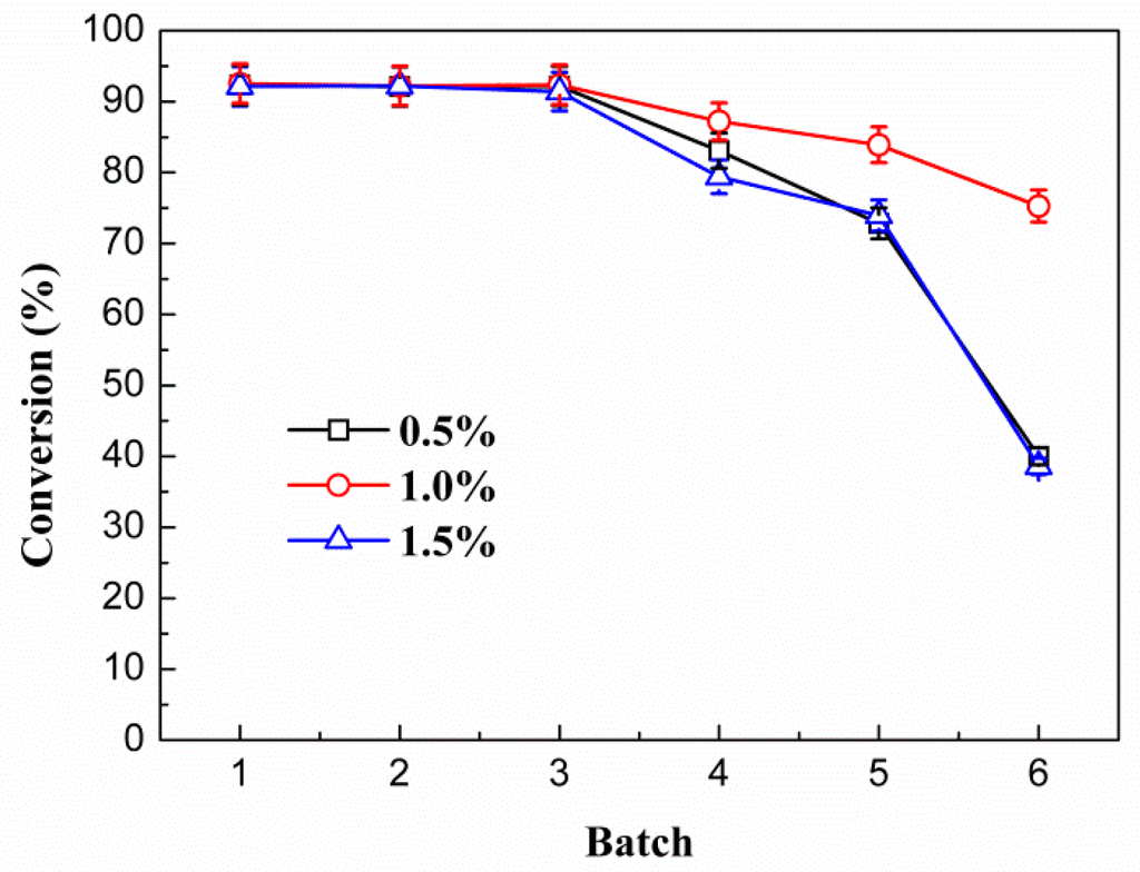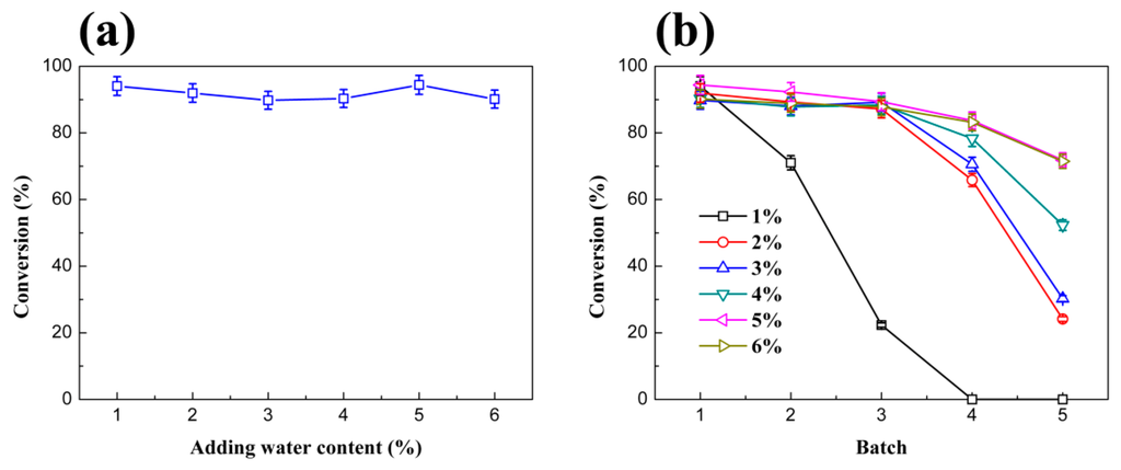 As shown in Figure 4a, the conversion ratio with different water content had no significant change. However, in the batches reactions as shown in Figure 4b, water content had a big impact on reusing conversion. The activity of reused enzyme fell off rapidly under the low water content environment. After five consecutive reactions with the same lipase, the conversion of the biodiesel improved gradually with the increasing of water content. This phenomenon indicated that the lipase’s active center can be protected by water. When the water content was increased to 5%, the lipase was fully protected, thus its activity cannot be further promoted with the continuously increasing of water content. Moreover, excess water may have some side-effects on the enzyme activity because it might make the lipase more flexible and may also lead to some unintended side-reactions such as hydrolysis, especially in the transesterification process [22]. Hence, 5% water content was considered to be the best condition in the later experiment.