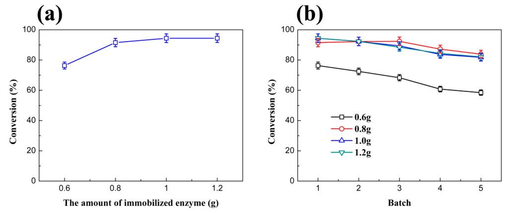 (a) The influence of the amount of immobilized enzyme for biodiesel conversion; and (b) the influence of the amount of immobilized enzyme for biodiesel reaction batches.