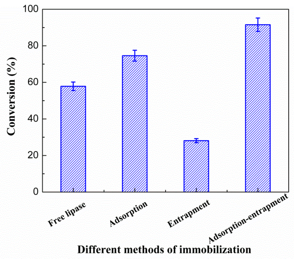 Thus, immobilized lipase combined with adsorption and entrapment could protect the lipase inside the pores and avoid desorption. In such processes, the additives such as ionic liquids, polyols and surfactants have a positive function [10,11,12]. Zhang et al. [13] have compared the effect of almost one hundred varieties of co-immobilizing agents on the esterification, including surfactants, fatty acids, fatty alcohol, metal ions and others. They found that different agents’ impacts on the activity of immobilized lipase varied, and co-immobilizing agents such as coconut oil, Tween80 and MgSO4 had an obvious synergy on the enzyme catalysis. However, few works have been completed regarding co-additives on immobilized lipase’s activity. In this study, five additives were added as co-immobilizing agents in the immobilization process. The concentration of co-immobilizing additive was optimized. Three different immobilized methods were compared on the basis of conversion ratio.