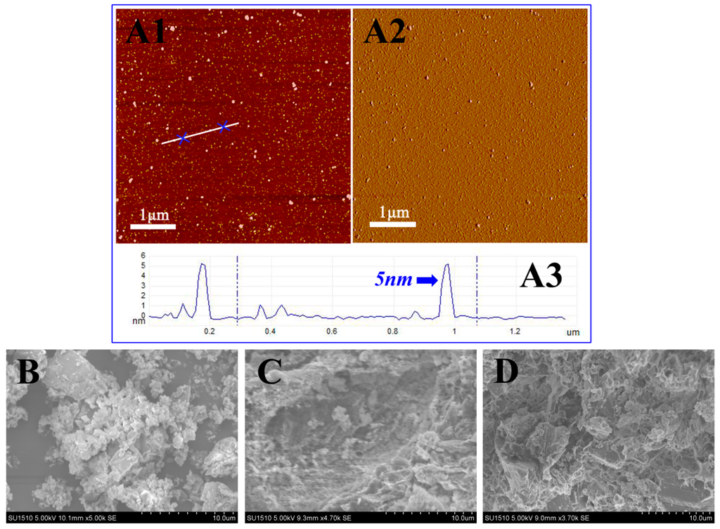 (A1) Typical Atom Force Microscopy (AFM) topographic images of free lipase; (A2) peak force error and (A3) corresponding height profiles of lipase. The Scanning Electron Microscopy (SEM) of (B) Lipase which was merely treated by adsorption onto diatomite (Catalyst A); (C) Lipase was entrapment into Ca-alginate gel (Catalyst B) and (D) the adsorption-entrapment immobilized lipase (Catalyst C).