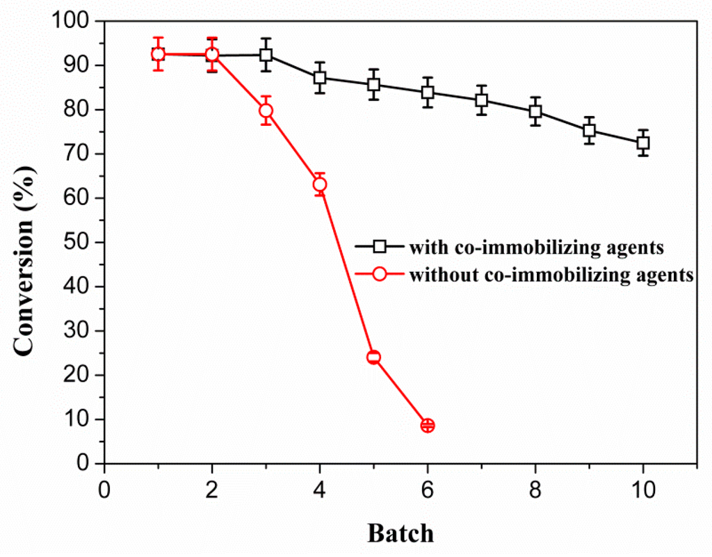 The effect of biodiesel conversion was assayed for six cycles with or without co-immobilization agent in order to find out the difference between them. The immobilized lipase with co-immobilizing agent was able to maintain a good activity with over 80% conversion after six subsequent uses and exceeds 70% after 10 subsequent reactions. However, without co-immobilized agent, the conversion was below or near to zero after six cycles (Figure 7). The co-immobilizing agent has positive impacts on the biodiesel yields, because the batch biodiesel conversion was significantly higher than the one in which co-immobilized agent was not used.