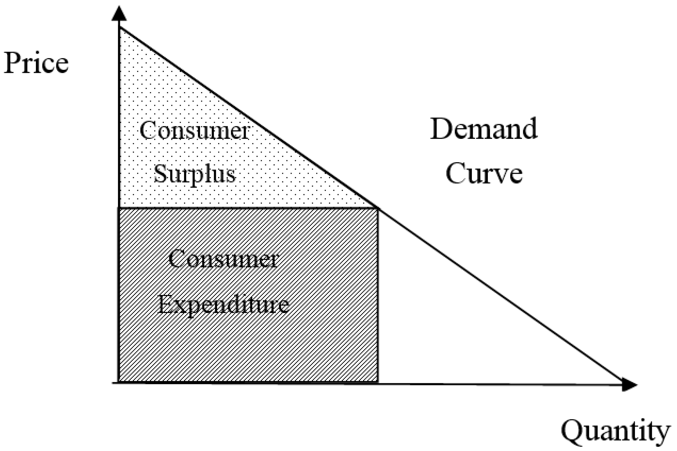 In the context of economics, the economic values of a service are defined as the area below the demand curve for the service. The area is precisely the consumers’ WTP for the service, and it is the sum of consumer surplus (CS) and actual payment [26]. The actual payment is expenditure to purchase and CS means the additional WTP. The CS is defined as the gap between a consumer’s additional WTP and the actual price, as shown in Figure 1. In other words, the economic benefits of the MS are the sum of the additional WTP and actual consumer expenditure. Thus, we can usually value the economic benefits by first estimating the demand function and then computing the area.