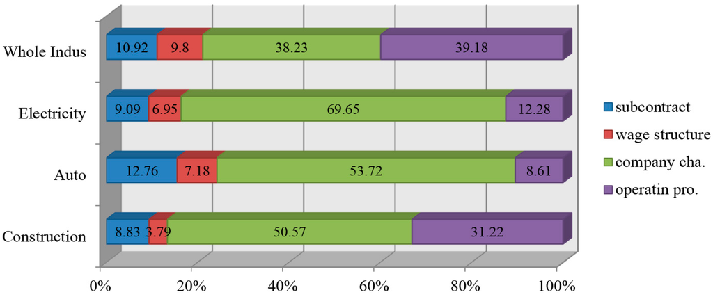 Moreover, it can be interpreted that the wage gap caused by the pay system and subcontract structure is larger in the auto industry. Previous empirical studies estimated that the ripple effect of employment is larger in the auto industry. However, it is well known that the rigidity of the pay system like the Hobong system and subcontract transactions has been practically fixed in the Korean auto industry. This suggests that, even though, the interaction between pay systems and subcontracts could create some employment in the auto industry through a broad ripple effect. In the construction industry, the proportion explained by pay systems and subcontract transactions is approximately 12.6 percent and lower compared to other industries. These results show that the effect of pay systems and the types of subcontract transactions on wage gap differs depending on industry. In this case, the policy that can consider the improvement of subcontract structures and pay systems simultaneously would be more effective. In addition, policy making decisions considering industry characteristics based on empirical analysis are needed because there exist differences in the causes and the degree to which the wage gap occurs in industries, such as auto, machine and equipment, as well as construction [].