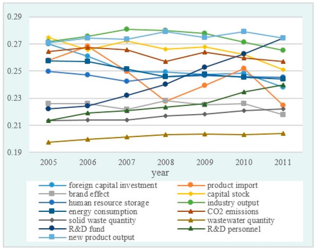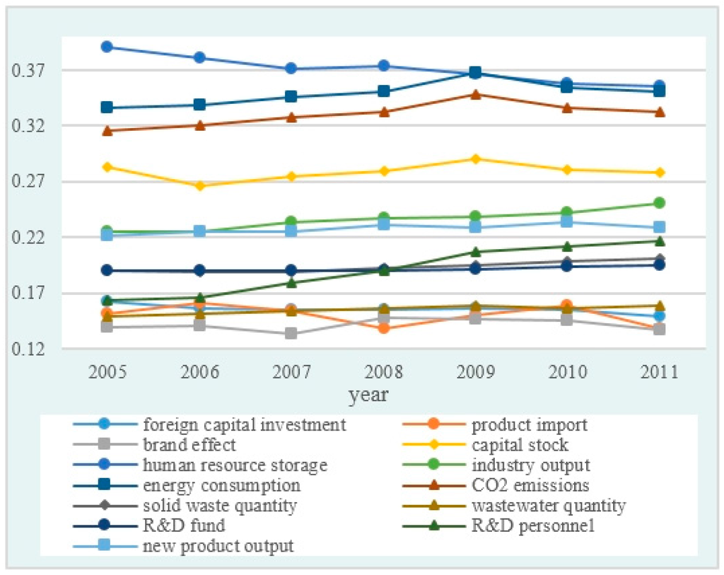 Moreover, in order to observe the changes over time, a descriptive statistical analysis of the measurement indexes is complemented (Due to the dimensions of the indexes are different, all the indexes have been standardized). Figure 2 and Figure 3 display the averages and standard deviations of 13 measurement indexes for 30 provinces from 2005 to 2011. It can be seen from the two graphs that these indexes present an ascending trend as a whole along with the time process.