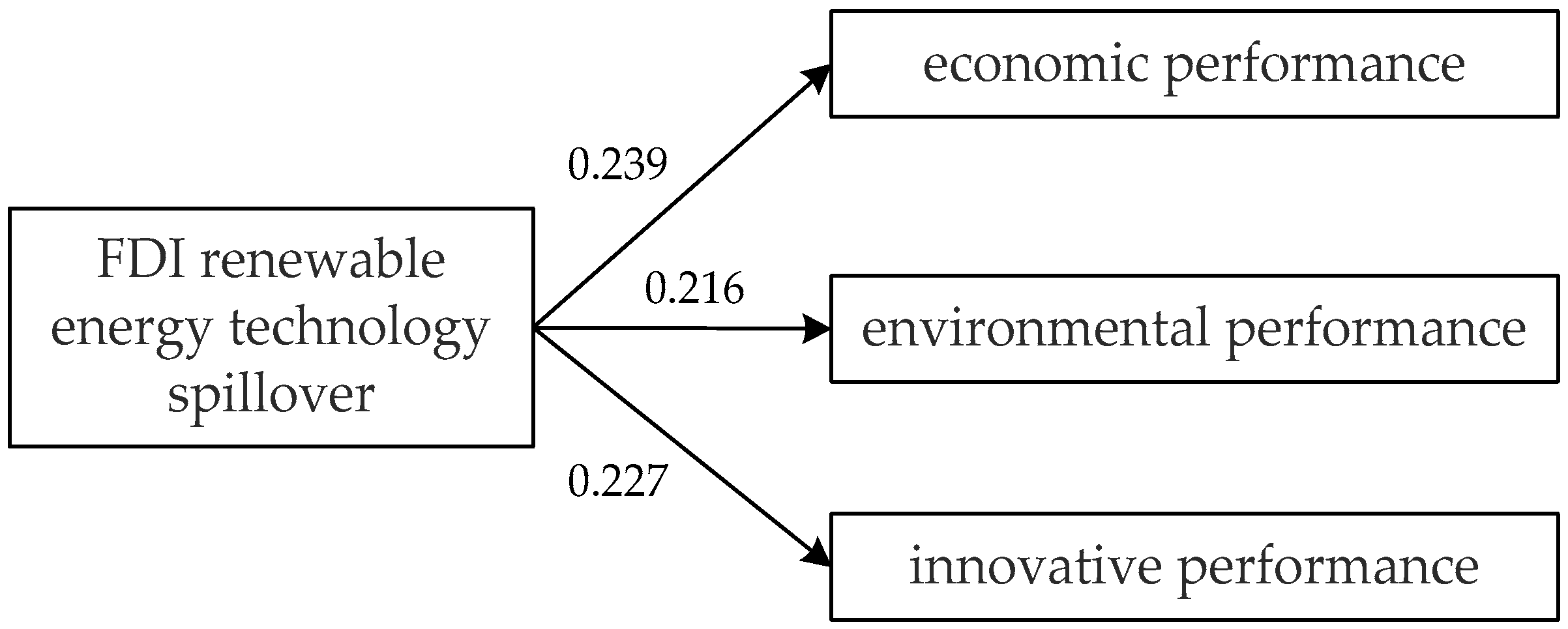 As can be clearly seen from the regression results in Figure 4, the regression coefficients of FDI renewable energy technology spillover and three performances are all positive. Meanwhile, the results are significant. It can be concluded that FDI renewable energy technology spillover has positive impacts on Chinese energy industry performance. Accordingly, the hypotheses H1, H2 and H3 can be confirmed. Furthermore, the effects of FDI renewable energy technology spillover on the individual indicators of economic, environment and innovative performance are examined, and the results are significant, as shown in Table 8.
