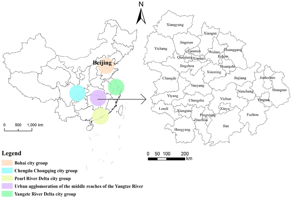 The UA in the middle reaches of the Yangtze River, also known as the “Triangle of Central China”, centers on the three provincial capital cities of Wuhan, Changsha, and Nanchang and what constitutes the cross-province region by combining the Wuhan Metropolitan Areas, the Ring of Chang-Zhu-Tan City Clusters, and the Poyang Lake Ecological Economic Zone (see Figure 1). The Erguang highway and multiple high-speed railways (Jingguang, Jingjiu, and Hukun railways) are the ties that form a whole. The UA in the middle reaches of the Yangtze River is situated in Central China and is connected to the Central Plains. This UA area is a gateway to China’s north–south and east–west linkages, and is an important part of the Yangtze River Economic Zone. Meanwhile, the UA in the middle reaches of the Yangtze River is the core area of economic and social development; it plays a crucial role in the urbanization of China, is the fourth pole of China’s regional economic development, and is considered one of the most important UAs. The land area of the UA is 317,000 km2, accounting for 3.3% of China’s land area. In 2014, the total population was 1.2 million, and the gross domestic product (GDP) was 6 × 106 million Yuan (RMB), accounting for 8.8% and 3.3% of the nation, respectively.