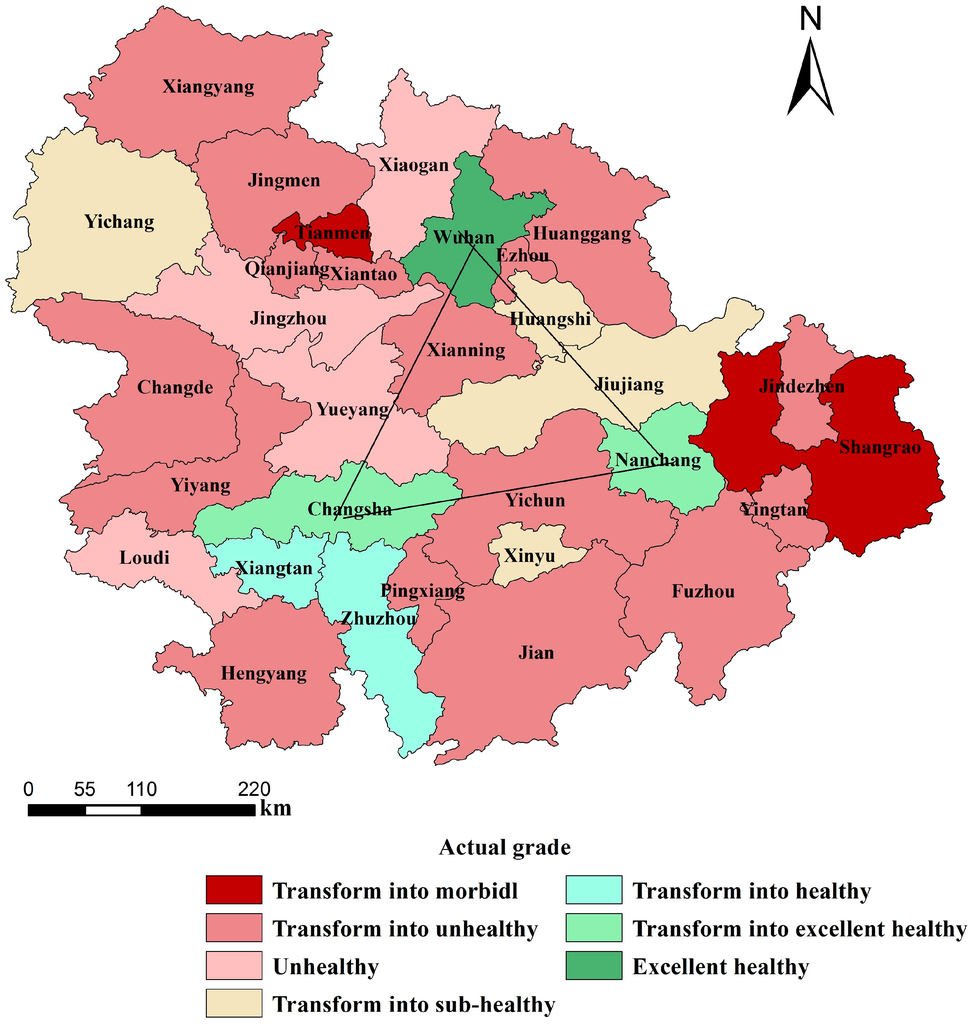 - The ecosystem health grades for Ezhou, Huanggang, Xiaogan, Xianning, Xiantao, Qianjiang, Xiangyang, Jingzhou, Jingmen, Yueyang, Yiyang, Changde, Hengyang, Loudi, Jindezhen, Yingtan, Yichun, Pingxiang, Fuzhou, and Jian are unhealthy or converting to unhealthy zones, accounting for 64.52% of the total number of cities in the UA. Rapid economic development in these central cities occurred because of the country’s increasing attention and support for the development of the central city. However, the social infrastructure and protection, and the environmental protection measures for small and medium cities have not matched the pace of economic development.