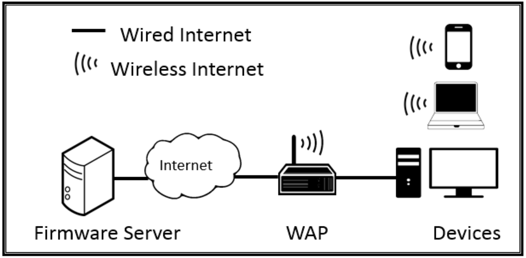 Figure 1 shows the network architecture of the firmware upgrade system. The firmware server and WAP are connected via a wired Internet connection. The firmware server stores the firmware of the WAP, and the WAP administrator upgrades the firmware or the upgrade is regularly scheduled. Devices that need to connect to the Internet use the WAP to join it.