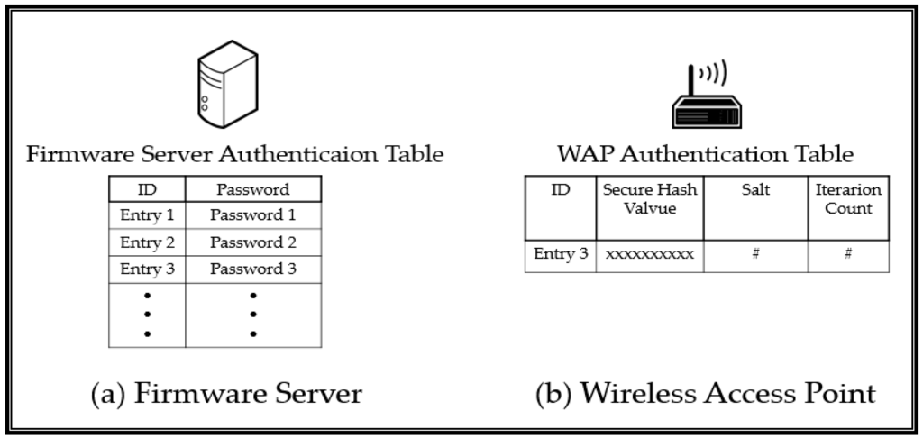 This is a very reasonable assumption because the WAP manufacturer can manage the WAP manufacturing process so that the authentication table can be stored in it. In addition, manufacturers can provide a firmware server to support firmware upgrades; thus, they can also store the authentication information. Figure 2 shows the authentication tables of the firmware server and WAP. Figure 2a shows the authentication table in the server, where the ID is used to find the matching password. Figure 2b shows the authentication table in the WAP. It contains the ID, secure hash value, salt, and iteration count. If the password is stored in plaintext in the WAP, it is vulnerable to data exposure. Hence, the WAP stores the password as a hash value. Furthermore, the salt and iteration count are used to secure the hash value. The salt is added to the password, and the result is passed through the hash function several times (equal to the iteration count). This makes it difficult for an attacker to guess the password using the exposed hash value [21,22]. It is a good method for protecting data from exposure, as a WAP is exposed to various attacks via software, the network, and hardware [23].